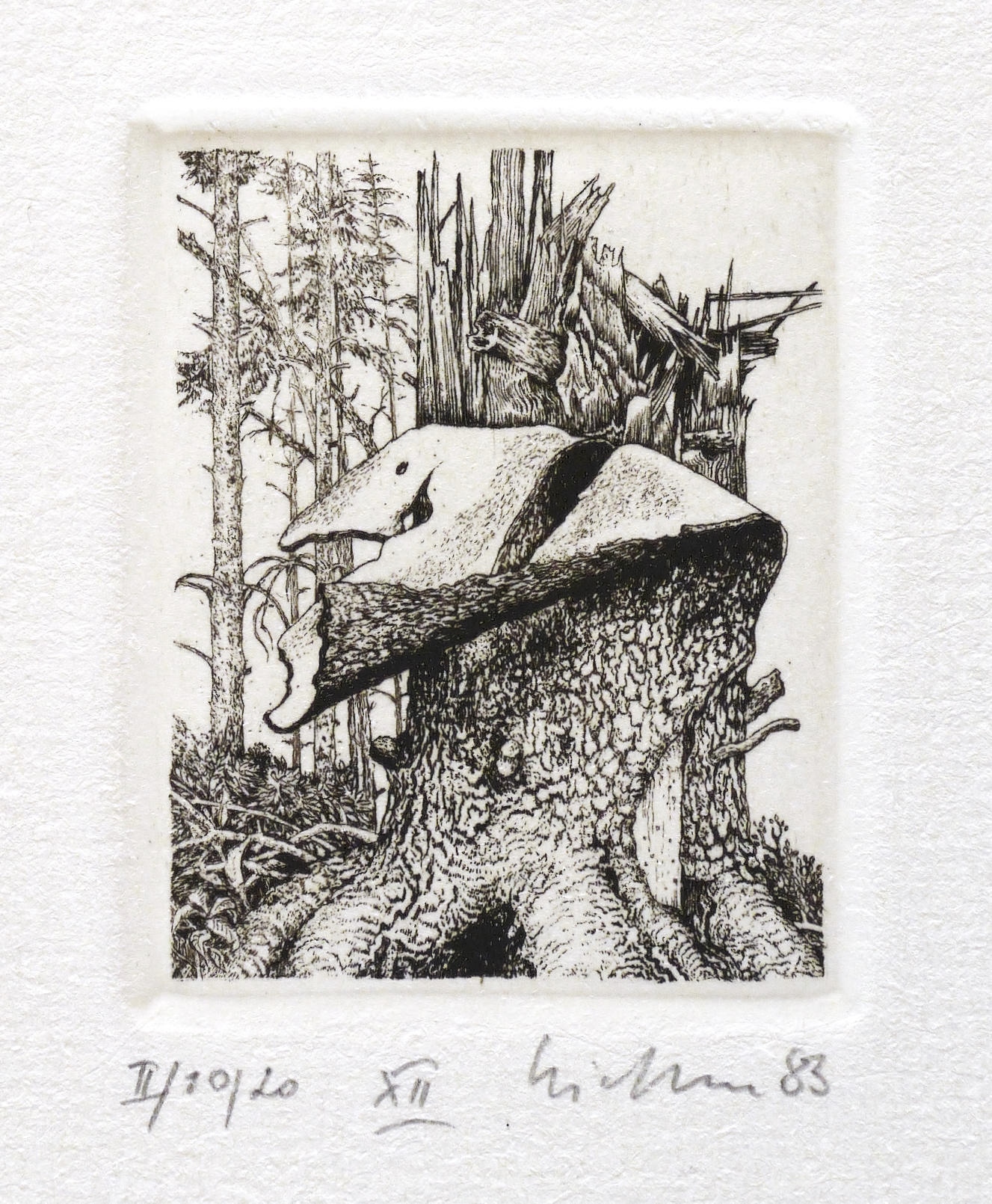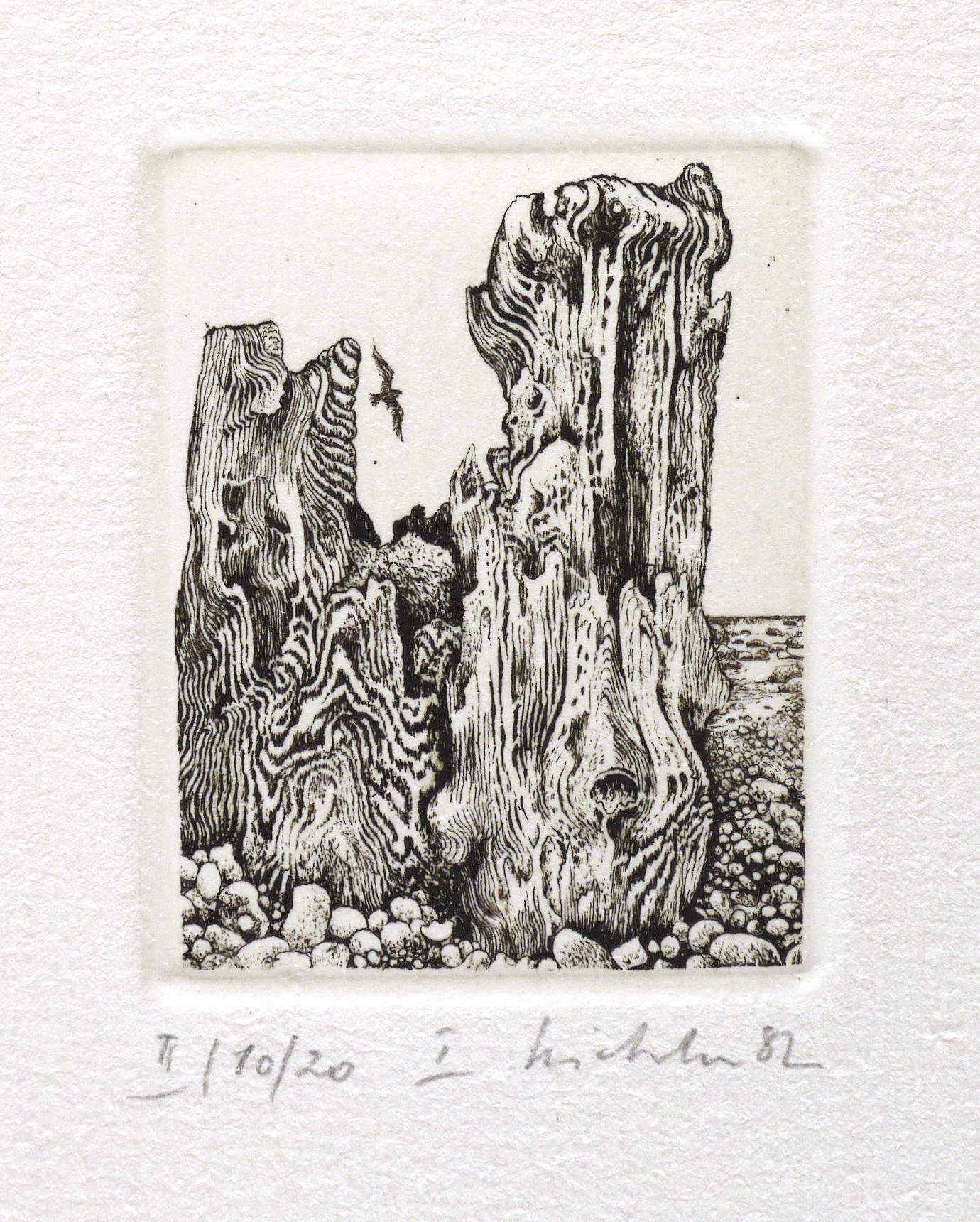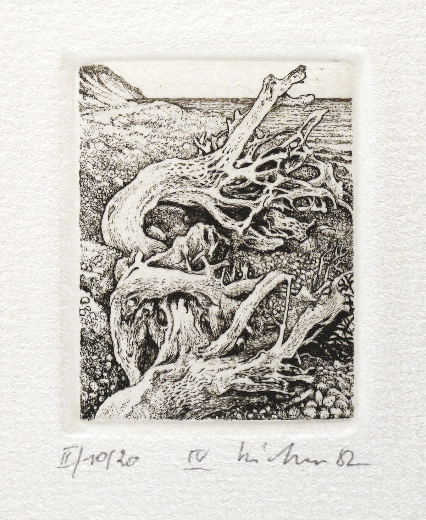 Aus: Gerenot Richter, Dreizehn Torsi (Berlin: Kunstverlag Edition Manfred Schmidt 1990). – Alle Grafiken rechts unten in Bleistift signiert und datiert. Links jeweils Auflagenbezeichnung: ″II/10/20″. Mittig Blatt-Nummer der Folge. Das Begleitheft mit dem Titelblatt ebenfalls mit Auflagenbezeichnung. – Kleine Grafik-Kassette mit der Folge ″Dreizehn Torsi″ von Gerenot Richter in der Edition des Kunstverlag Manfred Schmidt, Druck der Friedrichshagener Presse (1990) und Begleittext von Gisold Lammel. Enthalten die Radierungen: ″1. Torso (Eberesche/Abgefressen). - 2. Torso I (Buhnen). - 3. Torso II (Stubben). - 4. Torso III (Linde). - 5. Torso IV (Strandgut). - 6. Torso V (Buche). - 7. Torso VI (Fichte). - 8. Torso VII (Pappel). - 9. Torso VIII (Strandgut). - 10. Torso IX (Weide). - 11. Torso X (Strandgut). - 12. Torso XI (Weide). - 13. Torso XII (Fichte). – Abweichend von der Übersicht im Begleitheft ist das erste Blatt hier bezeichnet als: ″XIII″. – Vollständig mit Leinenkassette, Begleitheft und allen Grafiken. Keine Mängel. Sehr guter Zustand.