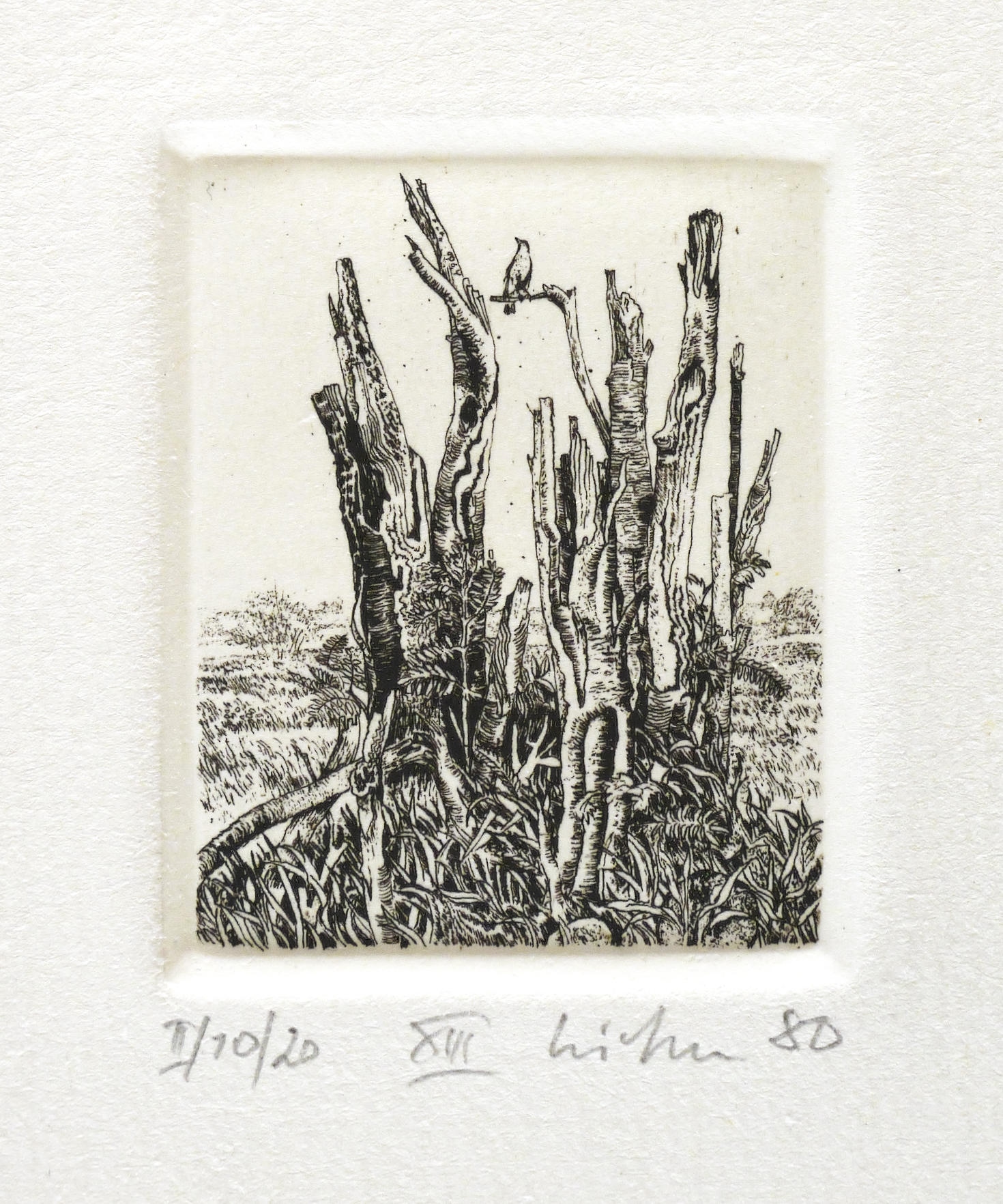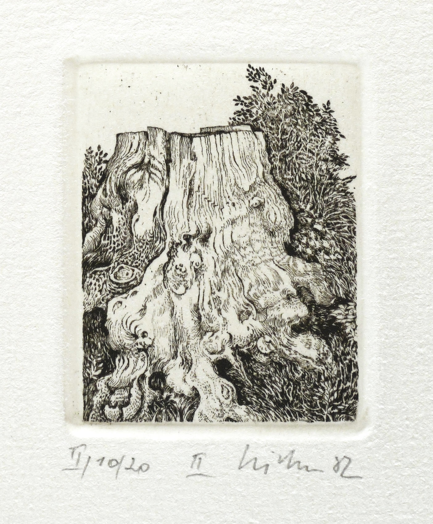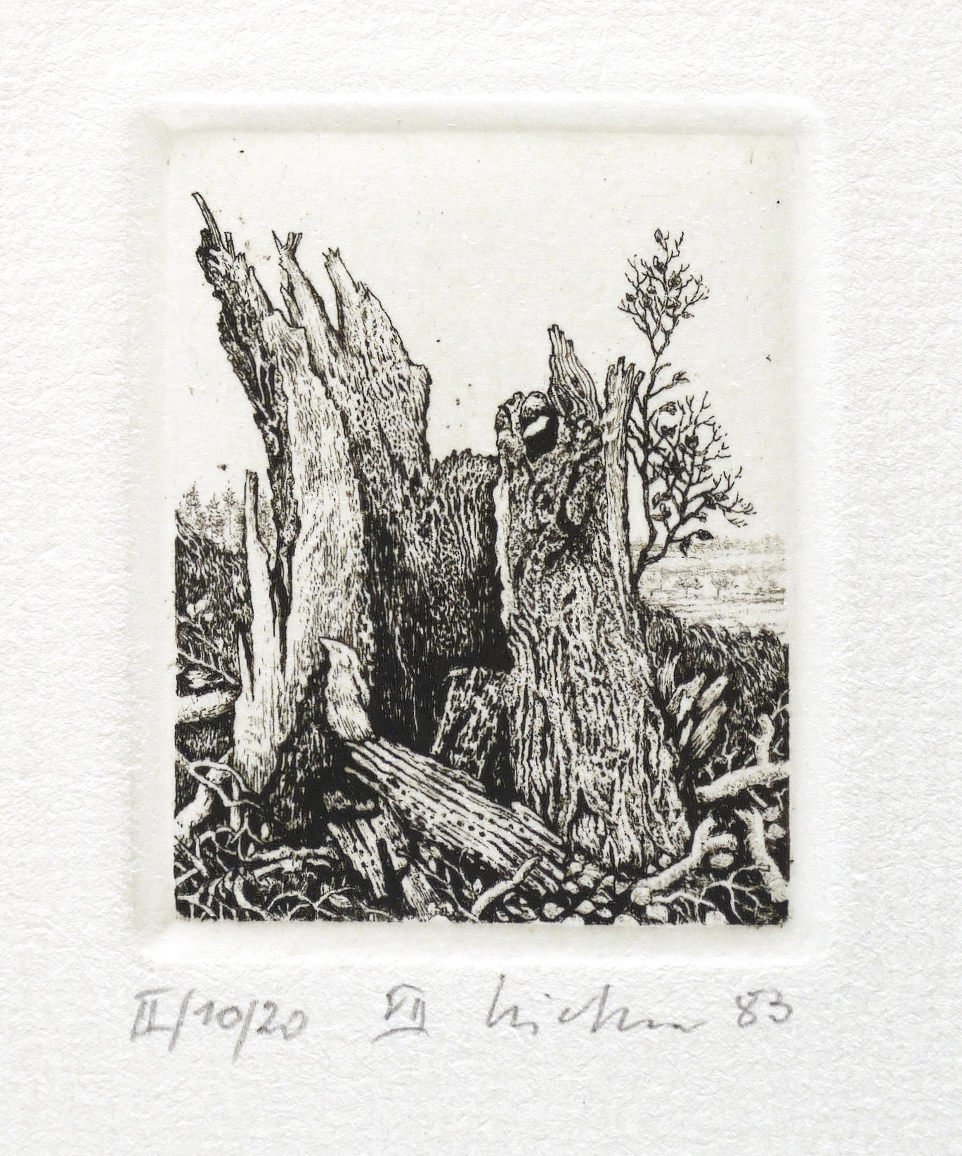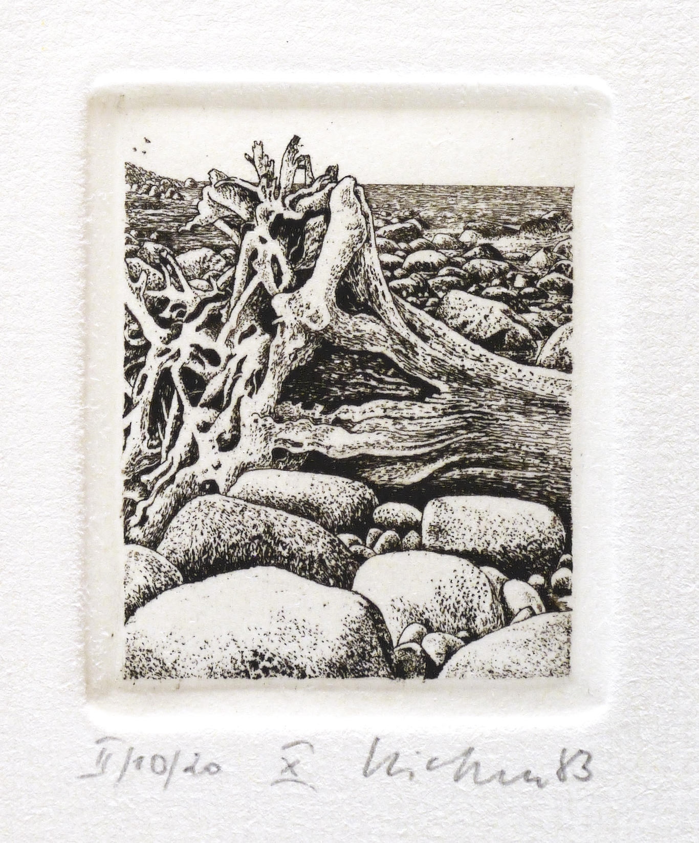 Aus: Gerenot Richter, Dreizehn Torsi (Berlin: Kunstverlag Edition Manfred Schmidt 1990). – Alle Grafiken rechts unten in Bleistift signiert und datiert. Links jeweils Auflagenbezeichnung: ″II/10/20″. Mittig Blatt-Nummer der Folge. Das Begleitheft mit dem Titelblatt ebenfalls mit Auflagenbezeichnung. – Kleine Grafik-Kassette mit der Folge ″Dreizehn Torsi″ von Gerenot Richter in der Edition des Kunstverlag Manfred Schmidt, Druck der Friedrichshagener Presse (1990) und Begleittext von Gisold Lammel. Enthalten die Radierungen: ″1. Torso (Eberesche/Abgefressen). - 2. Torso I (Buhnen). - 3. Torso II (Stubben). - 4. Torso III (Linde). - 5. Torso IV (Strandgut). - 6. Torso V (Buche). - 7. Torso VI (Fichte). - 8. Torso VII (Pappel). - 9. Torso VIII (Strandgut). - 10. Torso IX (Weide). - 11. Torso X (Strandgut). - 12. Torso XI (Weide). - 13. Torso XII (Fichte). – Abweichend von der Übersicht im Begleitheft ist das erste Blatt hier bezeichnet als: ″XIII″. – Vollständig mit Leinenkassette, Begleitheft und allen Grafiken. Keine Mängel. Sehr guter Zustand.