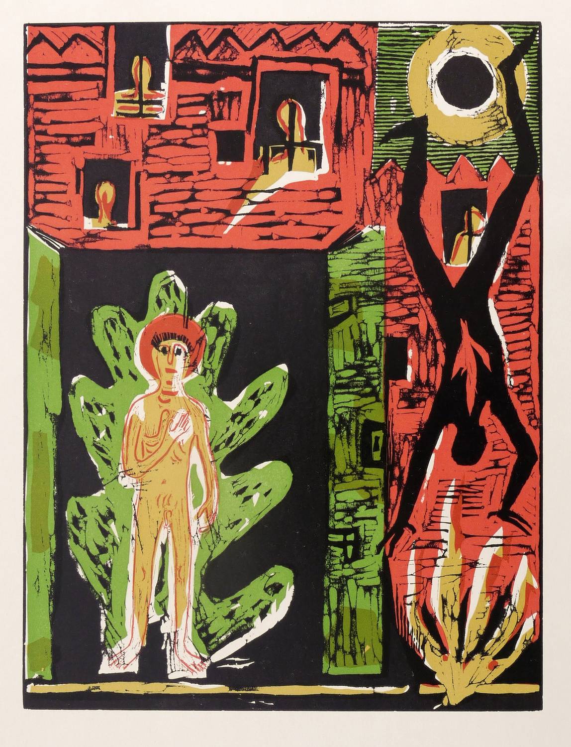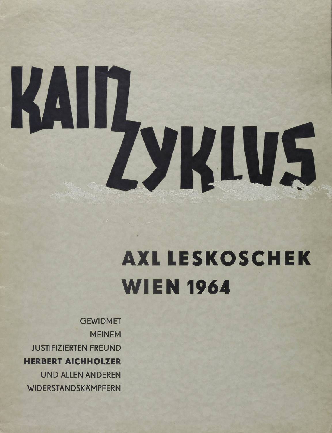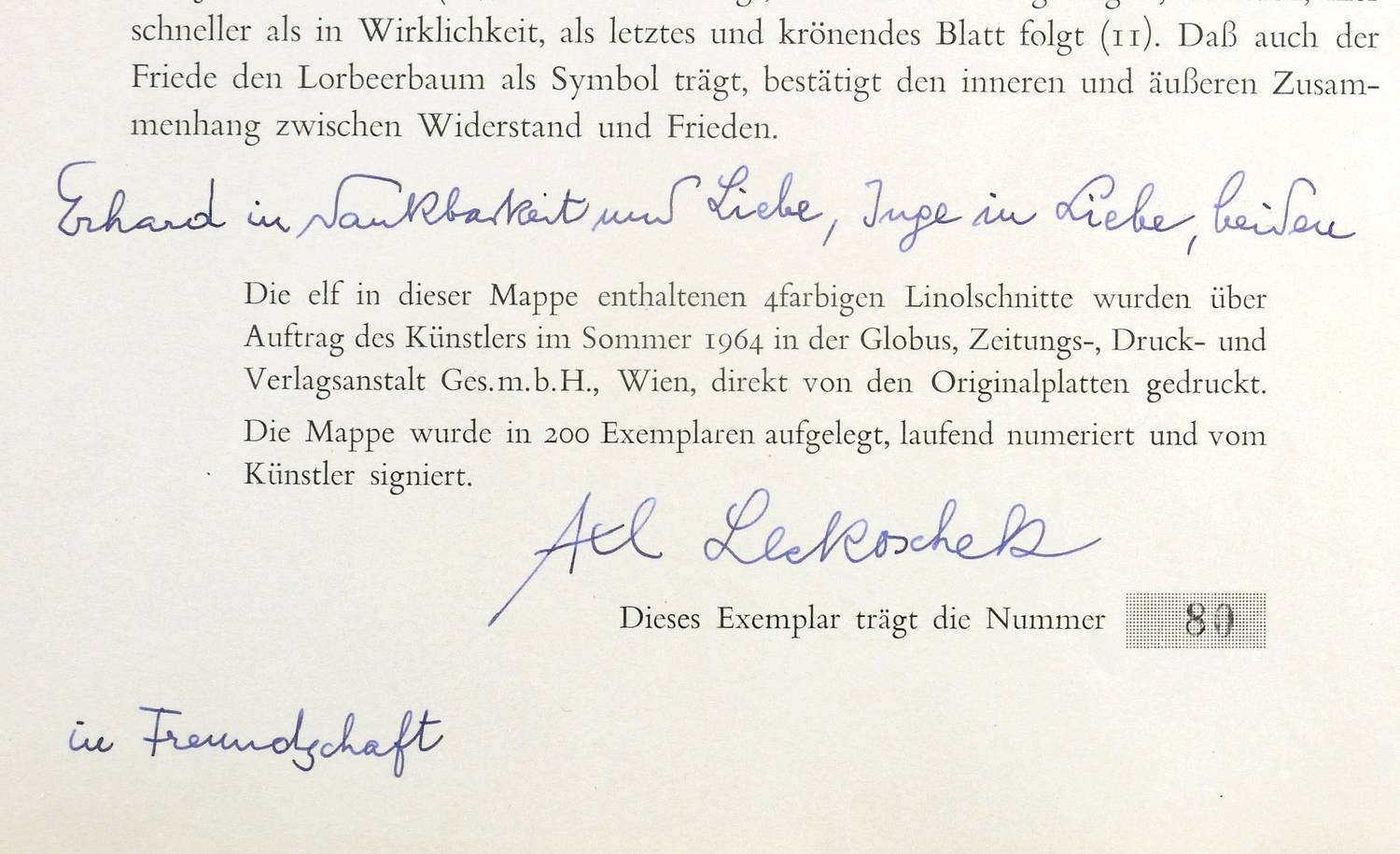 Aus: Axl Leskoschek, Kain-Zyklus (Wien: Eigenverlag 1964). – Im Impressum in blauer Feder signiert: ″Axl Leskoschek″. Dazu Exemplarnummer. Persönliche Widmung: ″Erhard in Dankbarkeit und Liebe, Inge in Liebe, beiden in Freundschaft″. – Folge der Drucke: 1. Kain ist der Mörder schlechtweg / sein Zeichen, das Kainszeichen, bezeichnet alles Tödliche. 2. Der Mensch ist dem Menschen ein Wolf. - 3. Der Sieger. - 4. Die im Schafpelz. - 5. Die gegen das Übel kämpfen / selbst ihr Leben hingeben. - 6. Die neue Saat. - 7. Feuer vom Himmel. - 8. Der tödliche Fisch. - 9. ″Wir wollen nicht mehr″. - 10. Zueinander im Dschungel. - 11. Der Friede. – Provenienz: Sammlung Inge & Erhard Frommhold, Dresden, später Sammlung Gerlint Söder, Dresden. – Vollständig mit allen Grafiken, Titelblatt-Textblatt-Impressum, Inhaltsangabe und Umschlag. Die Papiere altersbedingt schwach gegilbt und mit leichten Griffspuren. Umschlag mit Lagerspuren, im Bereich des Titels mit oberflächlichem Materialverlust. Mäßig guter bis guter Zustand.
