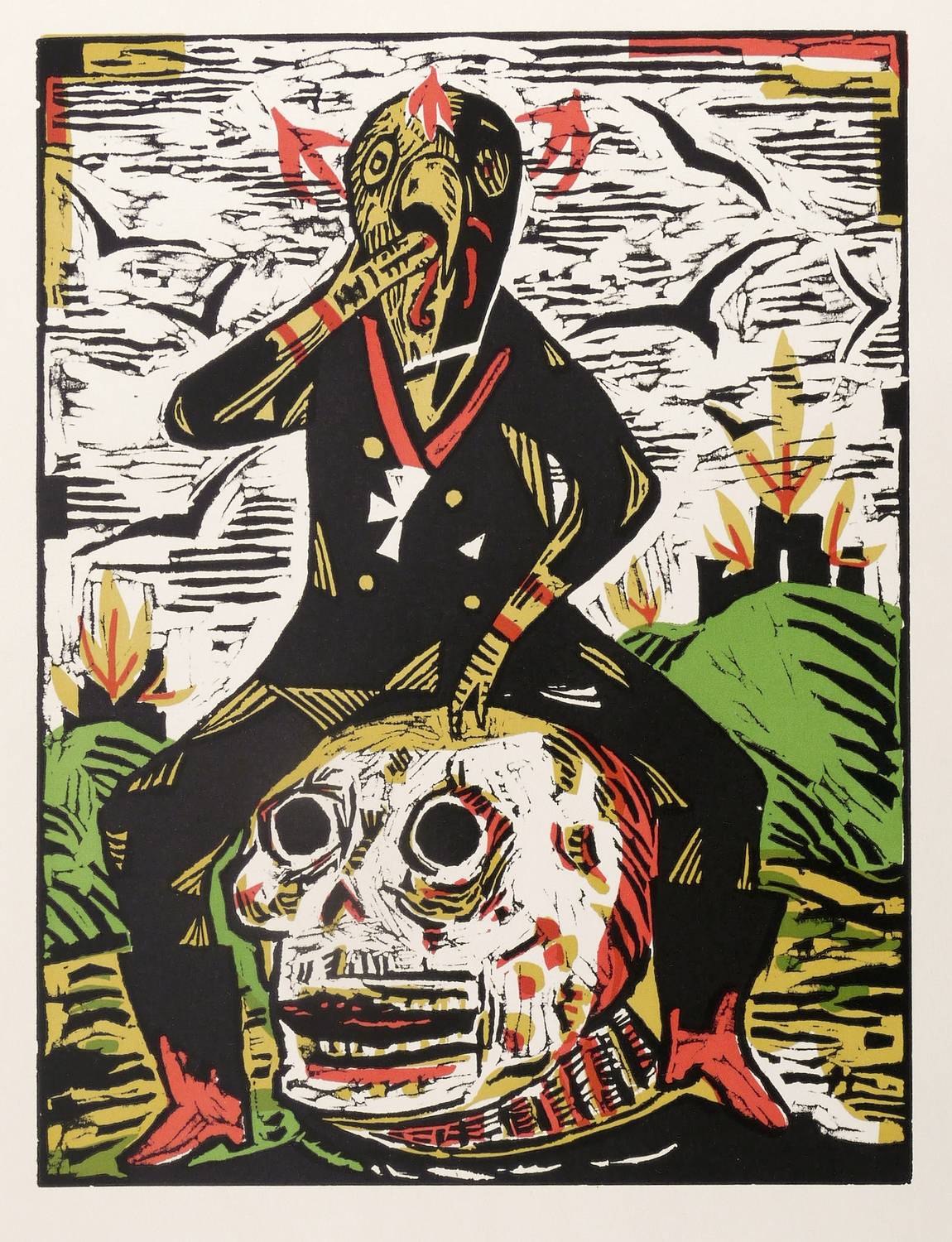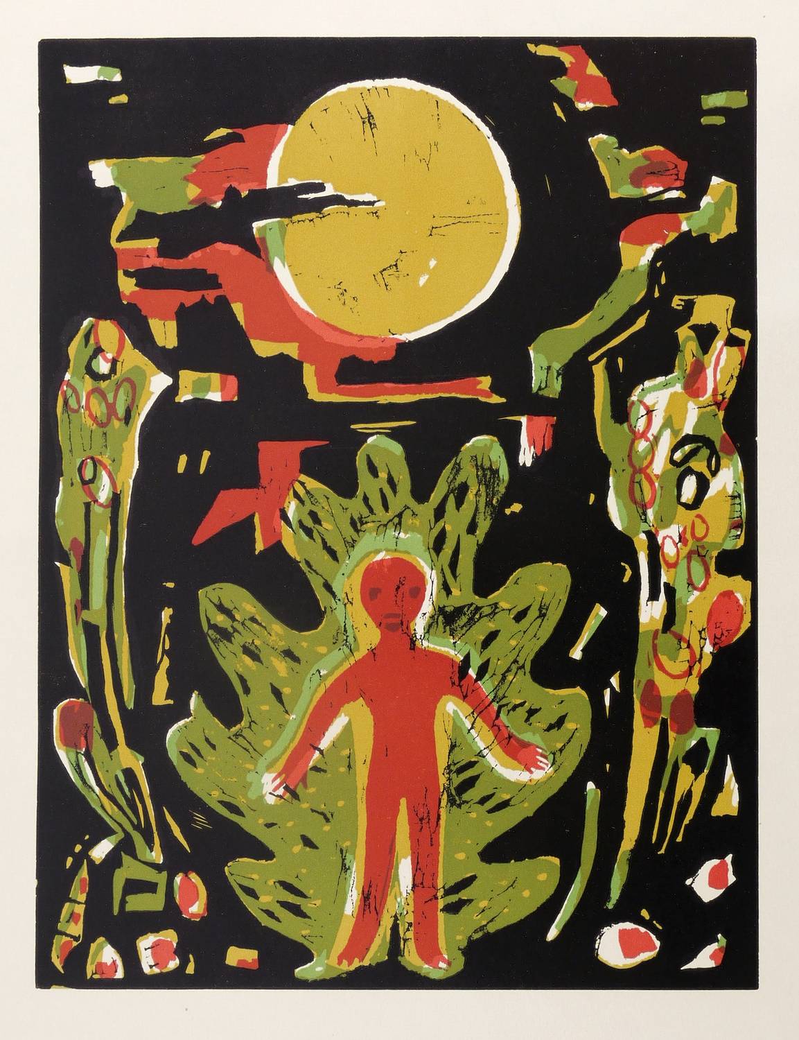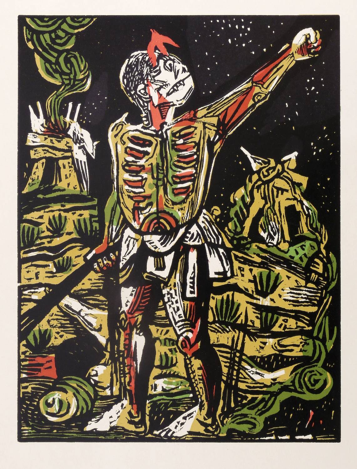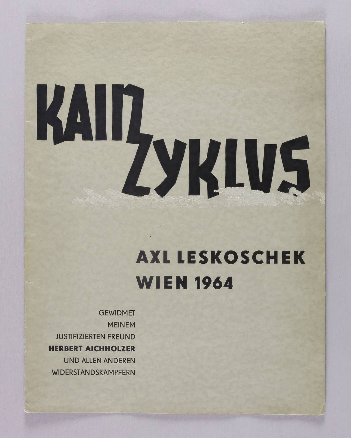 Aus: Axl Leskoschek, Kain-Zyklus (Wien: Eigenverlag 1964). – Im Impressum in blauer Feder signiert: ″Axl Leskoschek″. Dazu Exemplarnummer. Persönliche Widmung: ″Erhard in Dankbarkeit und Liebe, Inge in Liebe, beiden in Freundschaft″. – Folge der Drucke: 1. Kain ist der Mörder schlechtweg / sein Zeichen, das Kainszeichen, bezeichnet alles Tödliche. 2. Der Mensch ist dem Menschen ein Wolf. - 3. Der Sieger. - 4. Die im Schafpelz. - 5. Die gegen das Übel kämpfen / selbst ihr Leben hingeben. - 6. Die neue Saat. - 7. Feuer vom Himmel. - 8. Der tödliche Fisch. - 9. ″Wir wollen nicht mehr″. - 10. Zueinander im Dschungel. - 11. Der Friede. – Provenienz: Sammlung Inge & Erhard Frommhold, Dresden, später Sammlung Gerlint Söder, Dresden. – Vollständig mit allen Grafiken, Titelblatt-Textblatt-Impressum, Inhaltsangabe und Umschlag. Die Papiere altersbedingt schwach gegilbt und mit leichten Griffspuren. Umschlag mit Lagerspuren, im Bereich des Titels mit oberflächlichem Materialverlust. Mäßig guter bis guter Zustand.