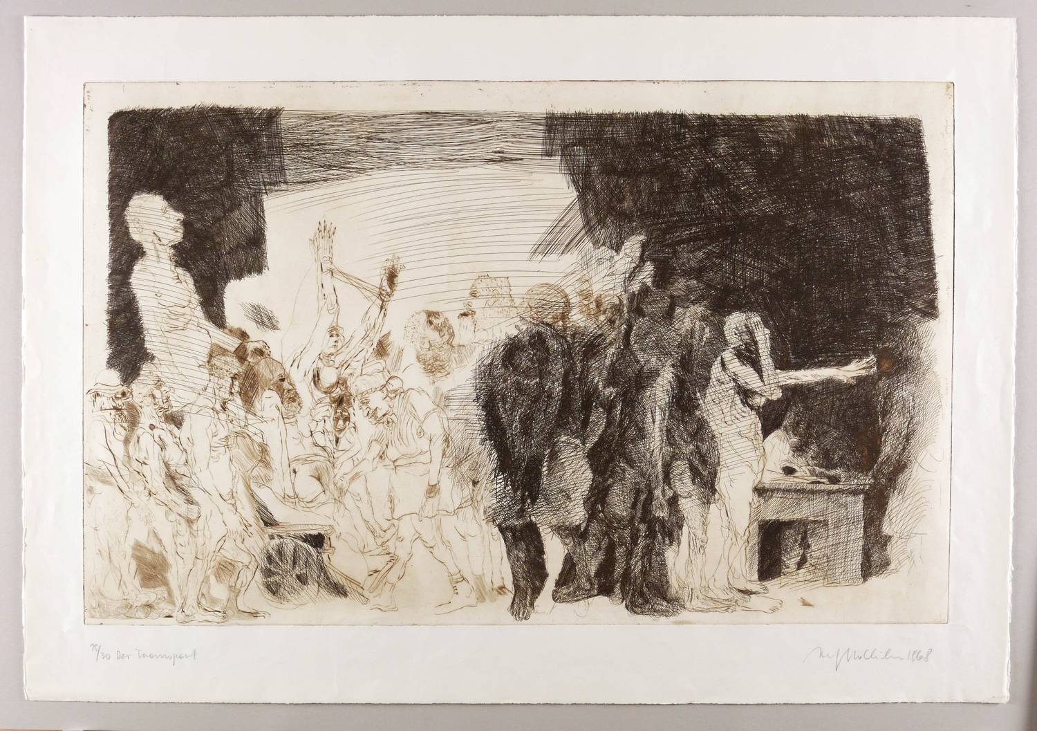 1968. Radierung / Strichätzung & Kaltnadel, in Schwarz, auf schwerem hellchamois Velin. – Originale Künstlergrafik, von Alfred Hrdlicka. – Auflage Exemplar Nr. 15/30. – 49,6 x 79,4 cm (Darstellung / Platte), 63 x 90 cm (Blatt).