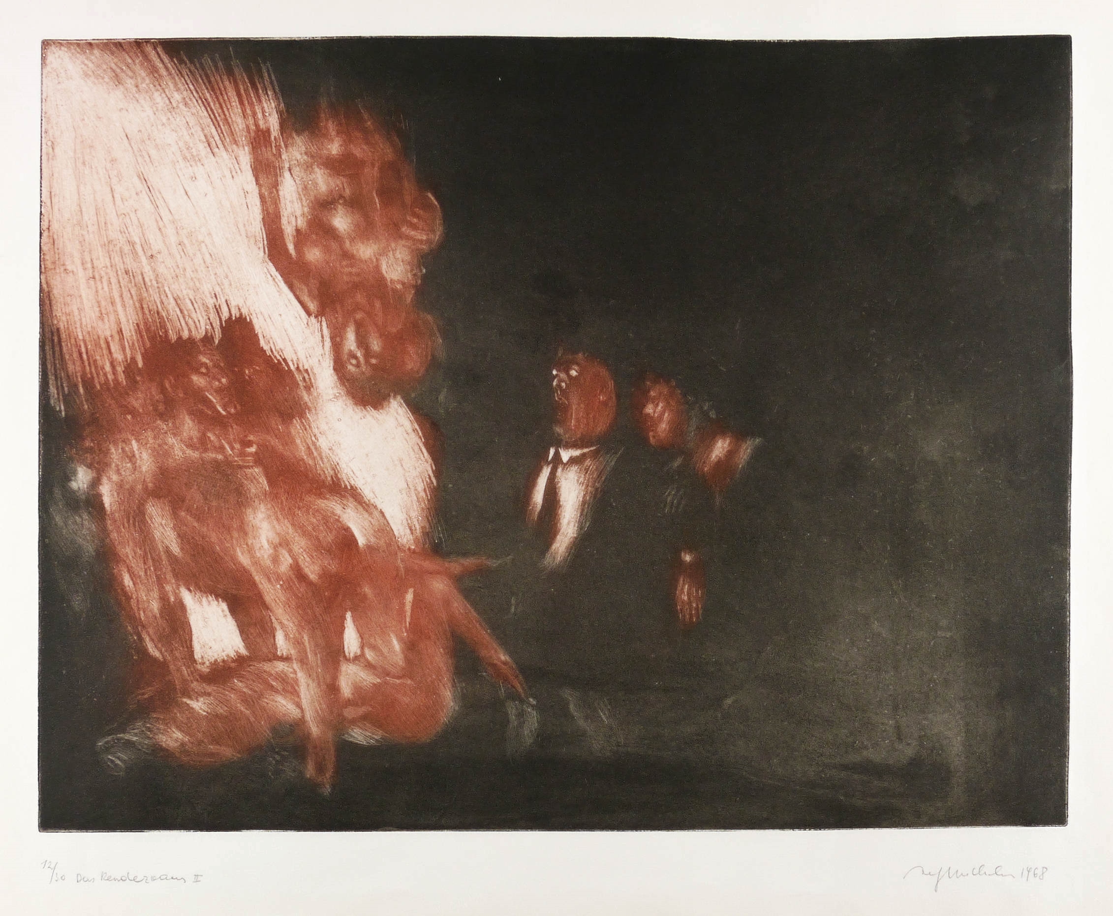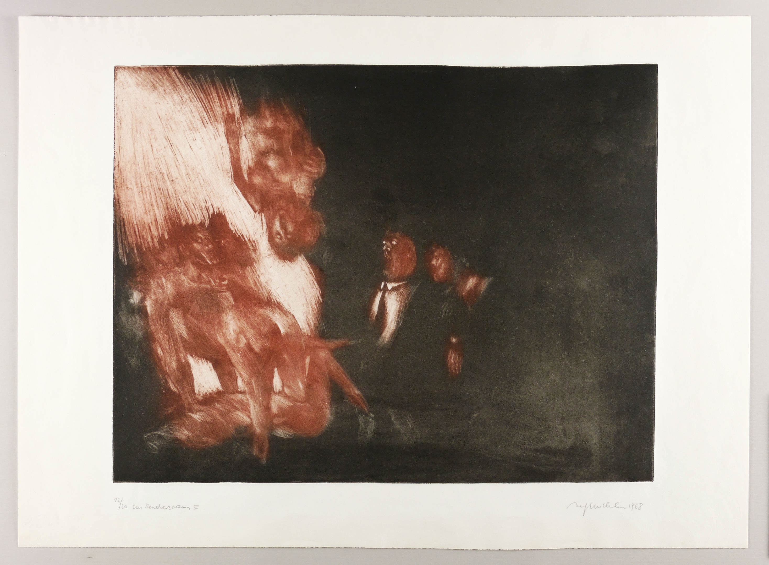 1968. Farbradierung / Aquatinta, geschabt, in Rot & Schwarz, auf weißem Velin. – Originale Künstlergrafik, von Alfred Hrdlicka. – Auflage Exemplar Nr. 12/30. – 49,6 x 64,2 cm (Darstellung / Platte), 63 x 87 cm (Blatt).