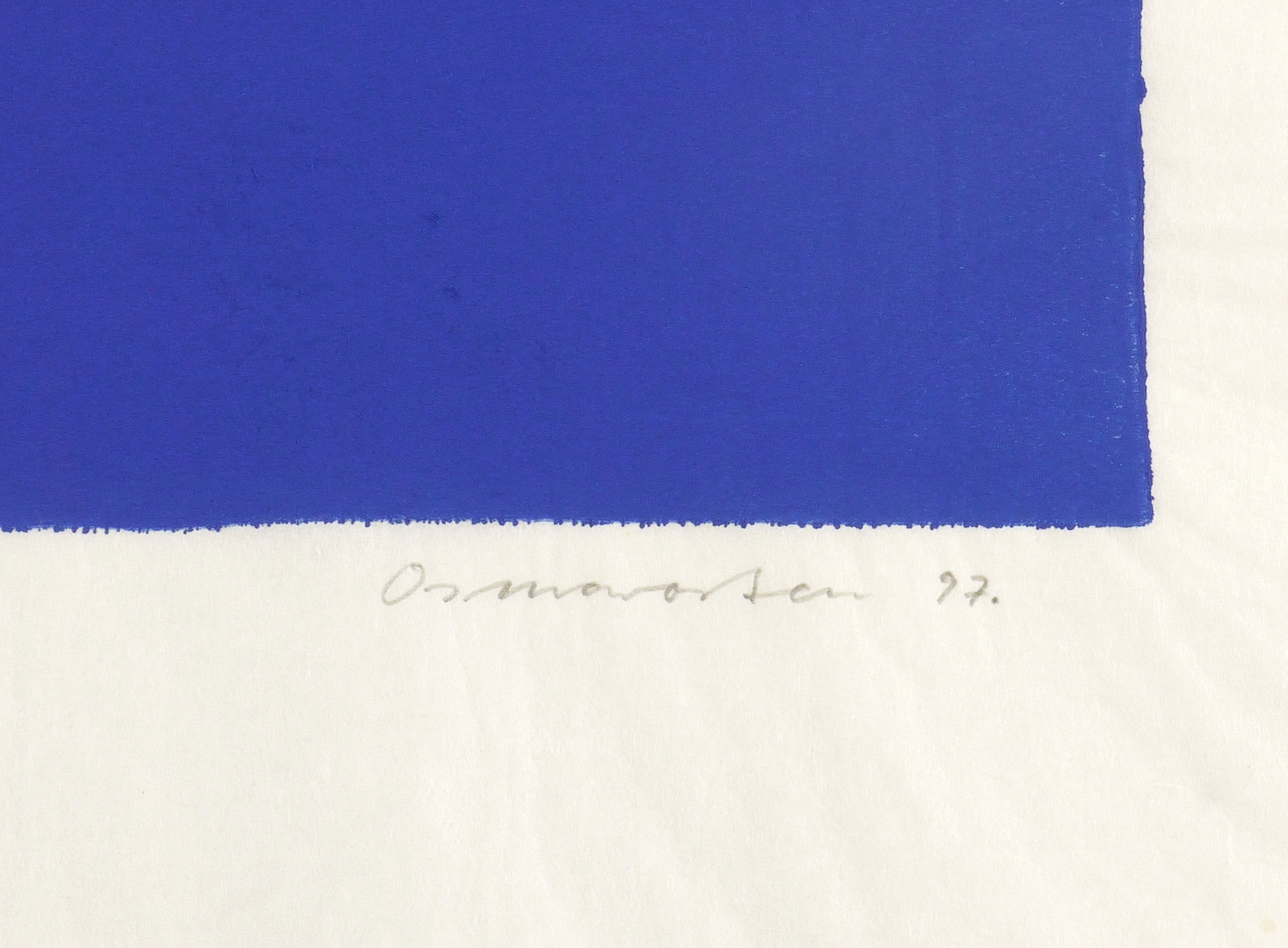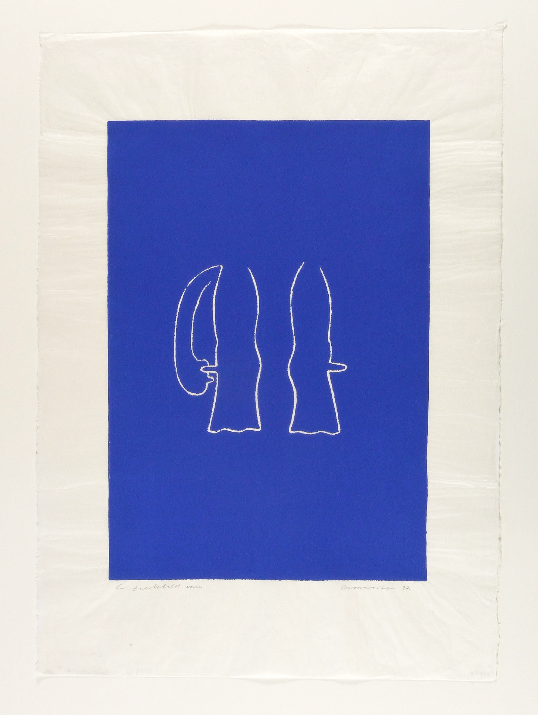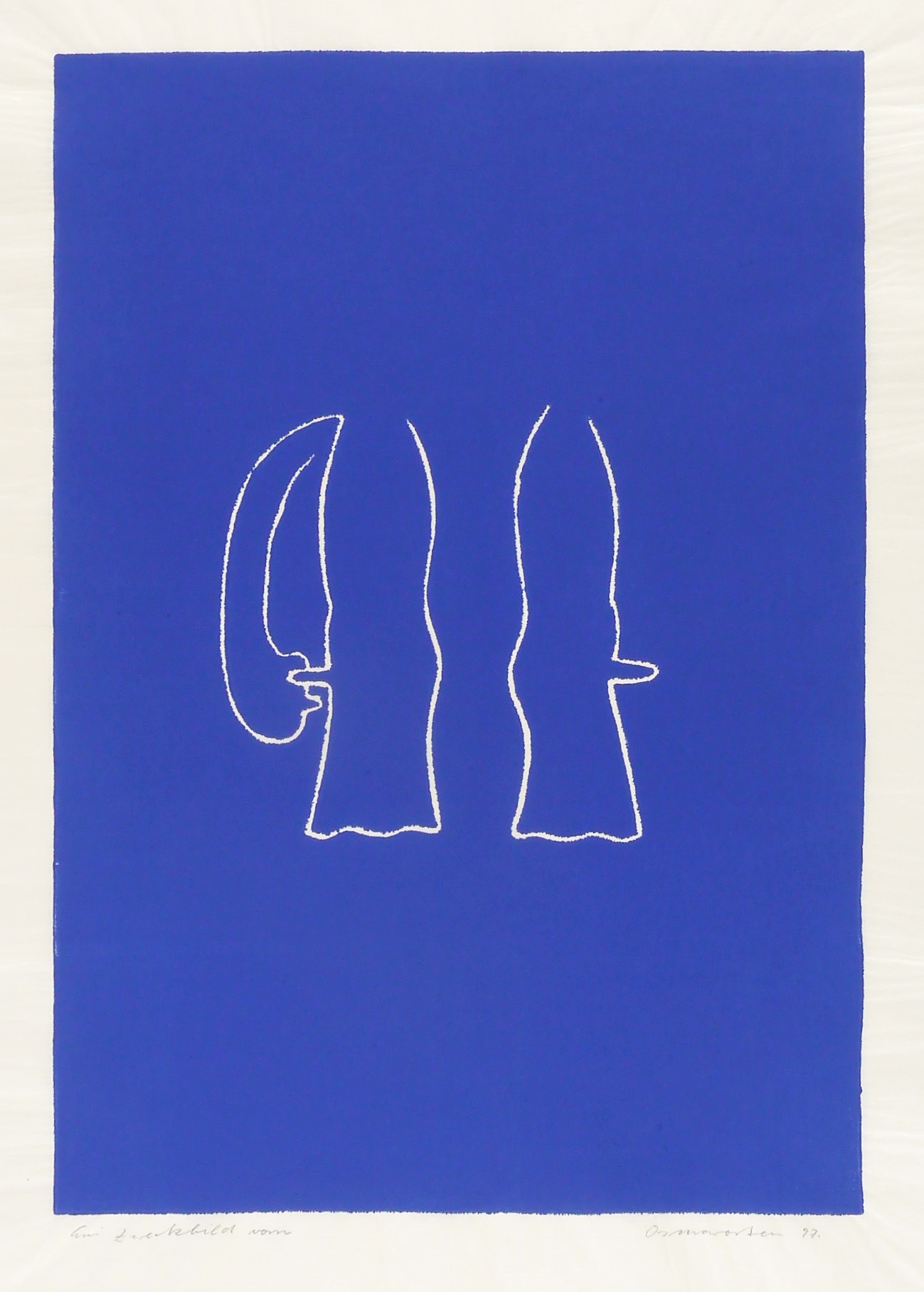 1997. Linolschnitt, in Blau, auf rauem hellchamois Japanbütten. – Originale Künstlergrafik, von Osmar Osten. – 63,2 x 43,8 cm (Darstellung / Druckbild), 89 x 64 cm (Blatt).