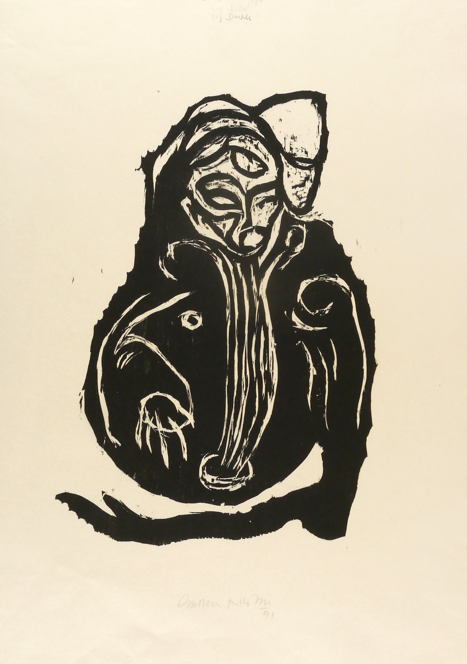 1992. Holzschnitt, in Schwarz, auf rauem gelblichem Japanbütten. – Originale Künstlergrafik, von Carsten Nicolai. – 61,0 x 43,4 cm (Darstellung / Druckbild), 98 x 65 cm (Blatt).