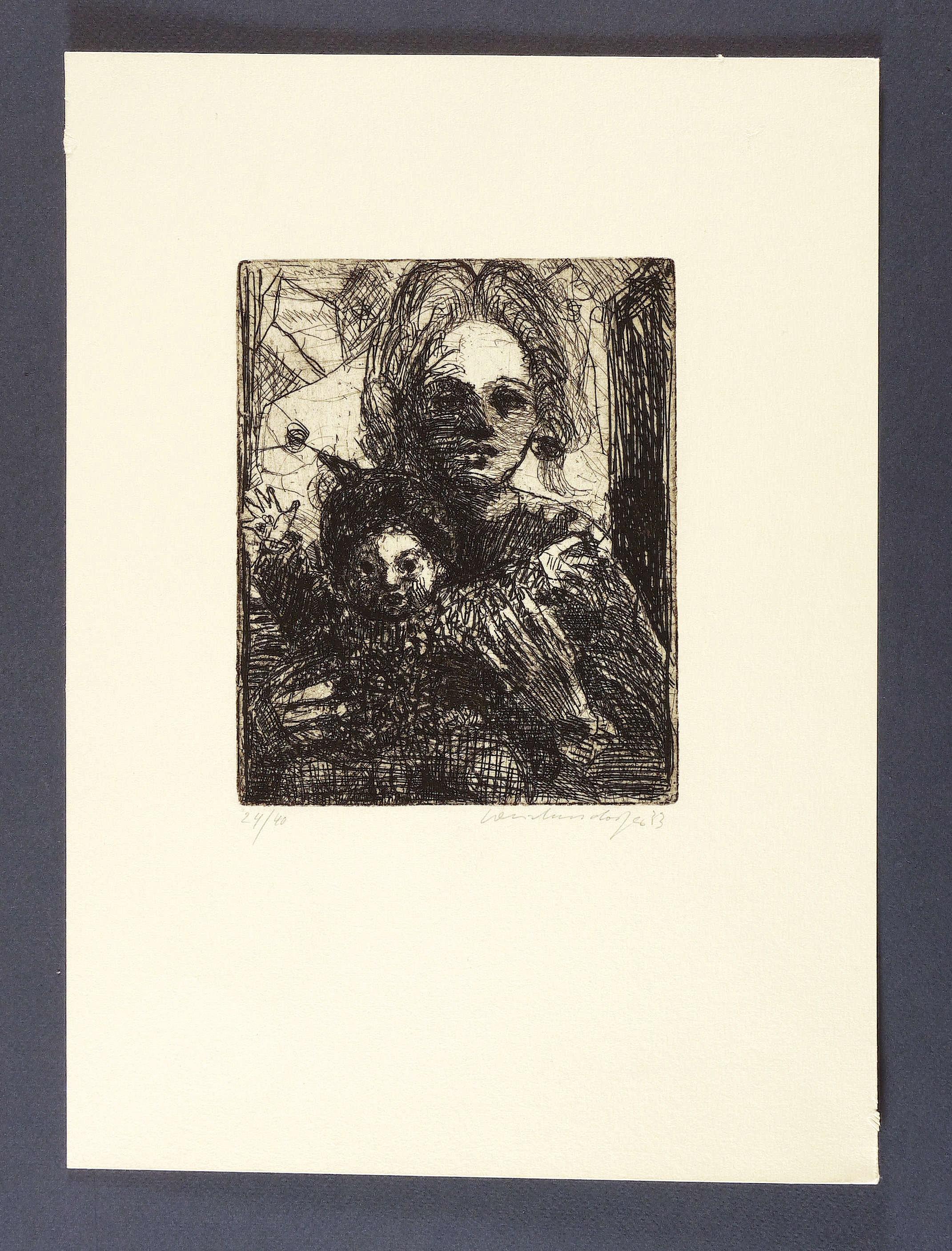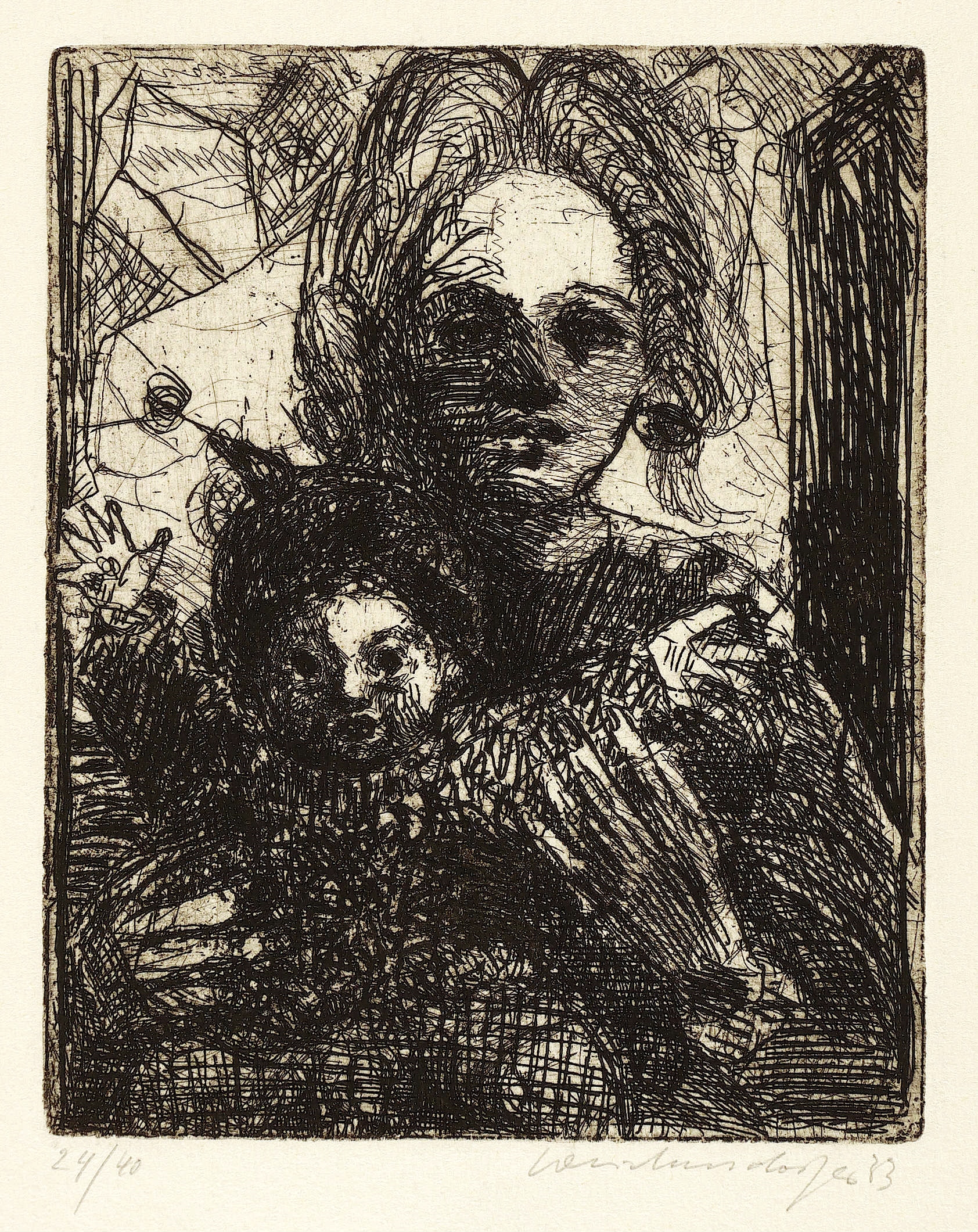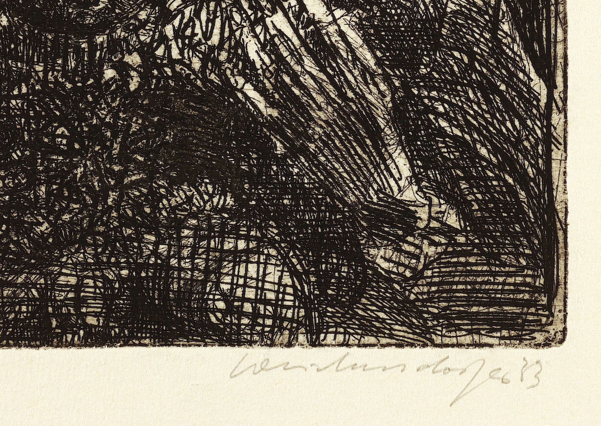 1983. Radierung / Strichätzung, in Schwarz, auf hellchamois Büttenkarton. – Originale Künstlergrafik, von Claus Weidensdorfer. – Auflage Exemplar Nr. 24/40. – 17,8 x 14,3 cm (Darstellung / Platte), 36 x 26 cm (Blatt).