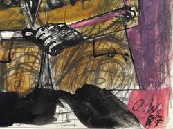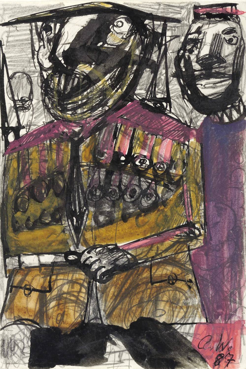1987. Zeichnung / Feder, Tusche & Aquarell, über Bleistift, auf Papier. – Originale Künstlergrafik, von Claus Weidensdorfer. – Unikat. – 20,0 x 14,0 cm (Darstellung / Blatt).