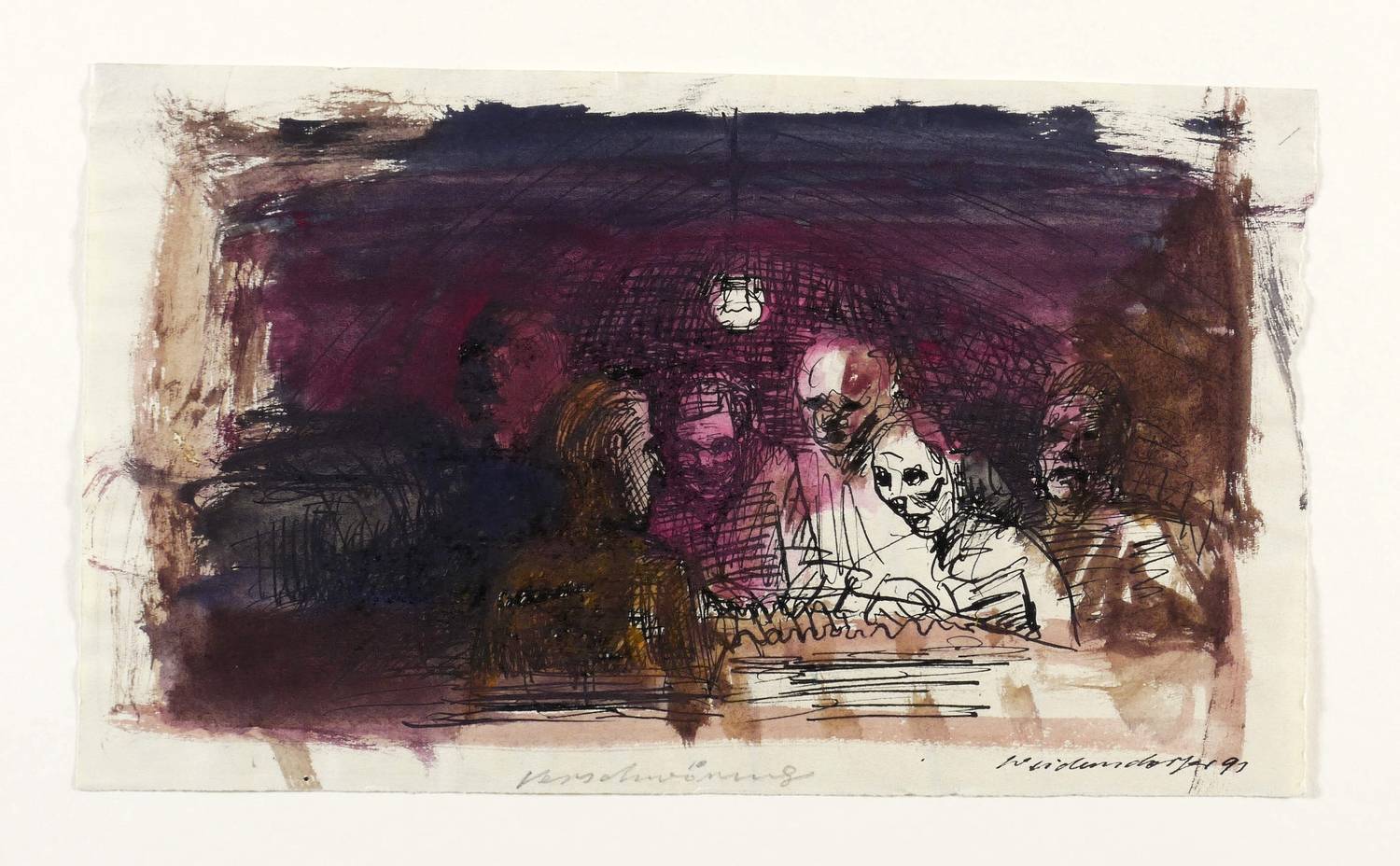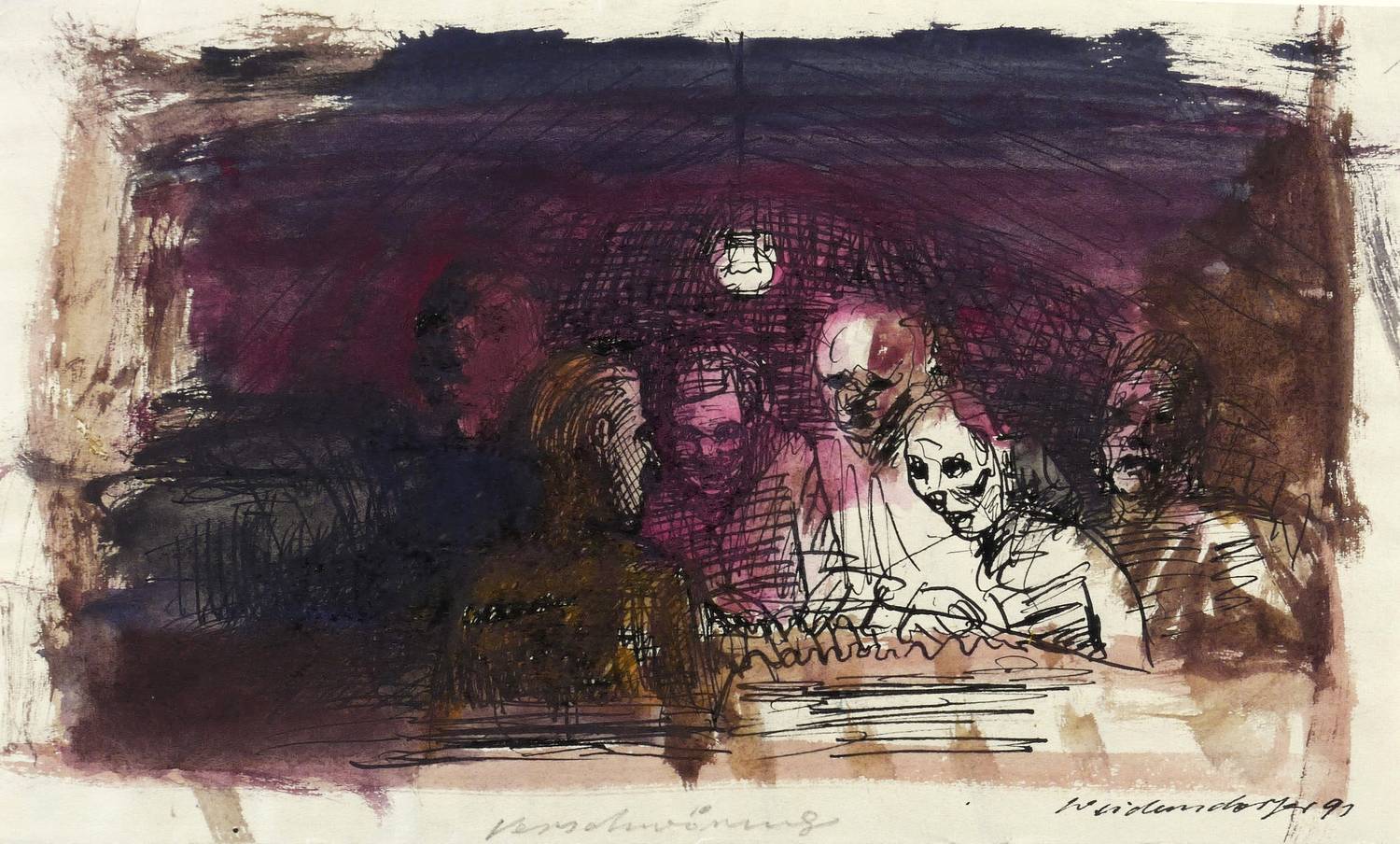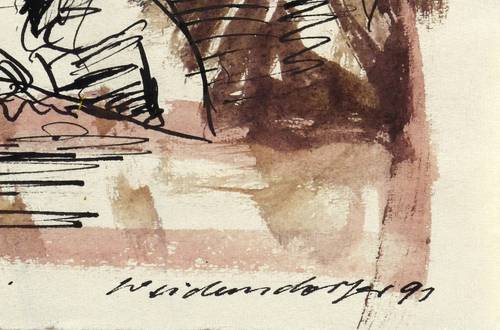 1991. Zeichnung / Feder, Tusche & Aquarell, auf Karton. – Originale Künstlergrafik, von Claus Weidensdorfer. – Unikat. – 18,0 x 30,5 cm (Darstellung / Blatt).