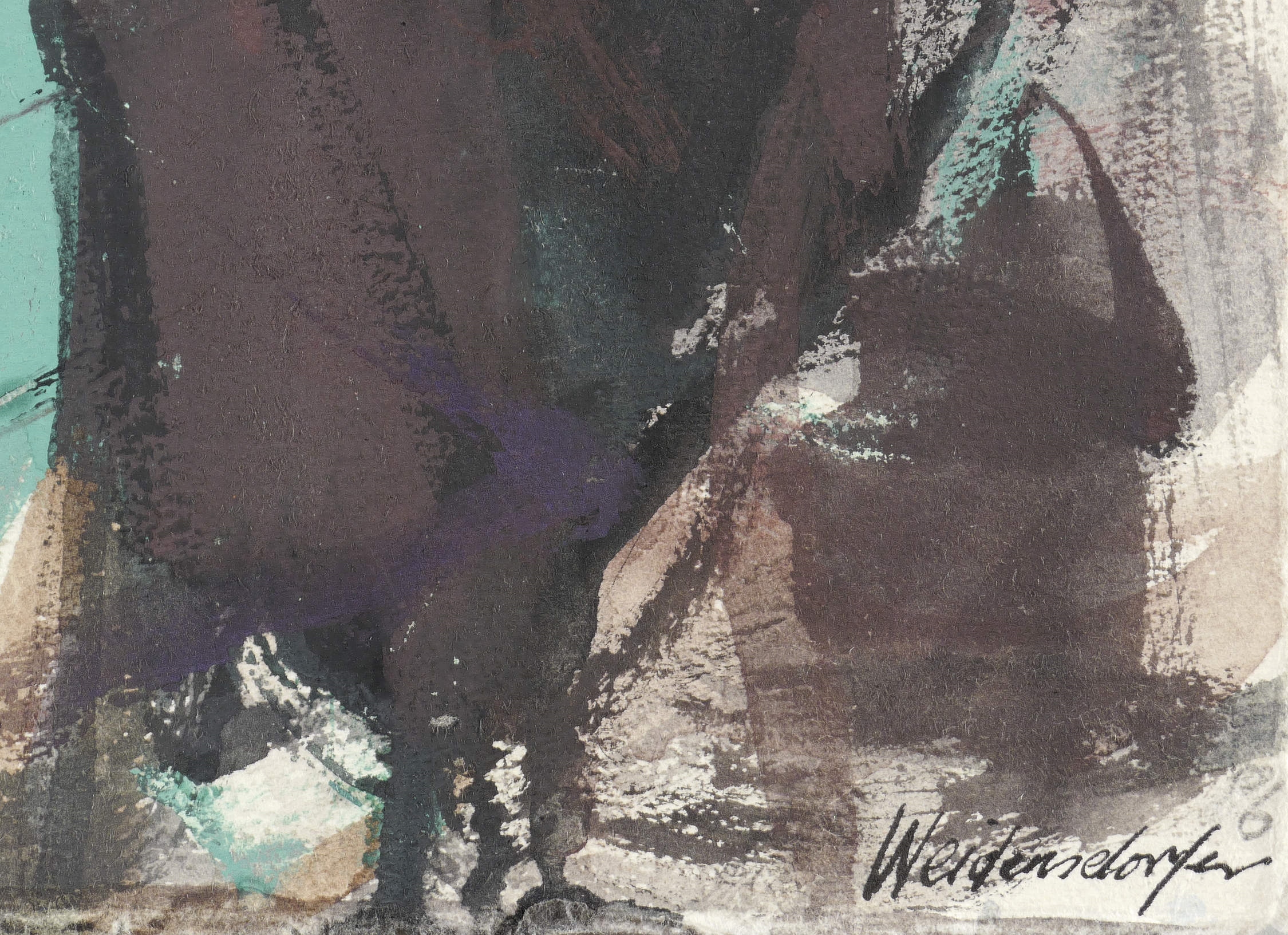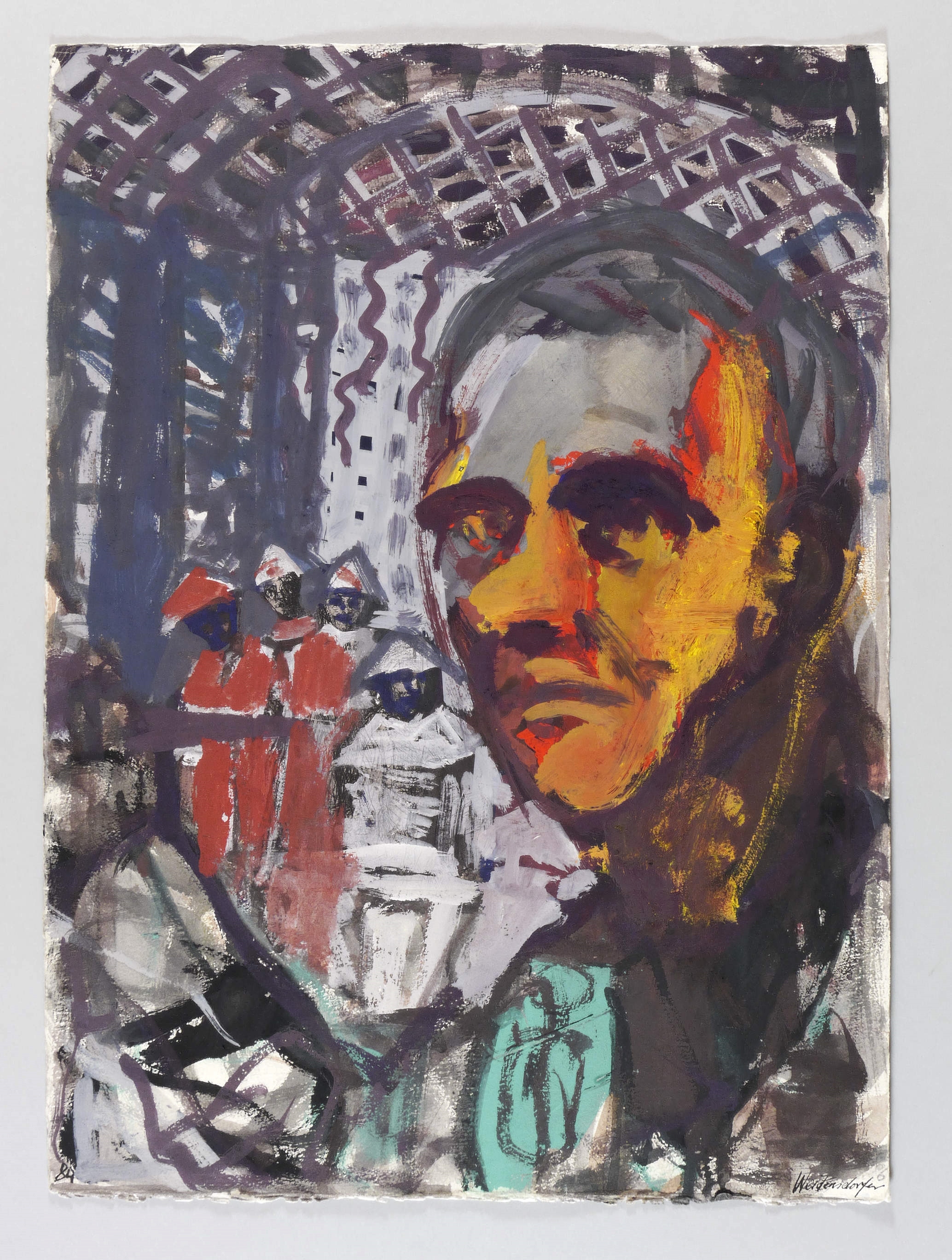 1989. Zeichnung / Gouache, über Radierung, auf Büttenpapier. – Originale Künstlergrafik, von Claus Weidensdorfer. – Unikat. – 53,5 x 39,0 cm (Darstellung / Blatt).