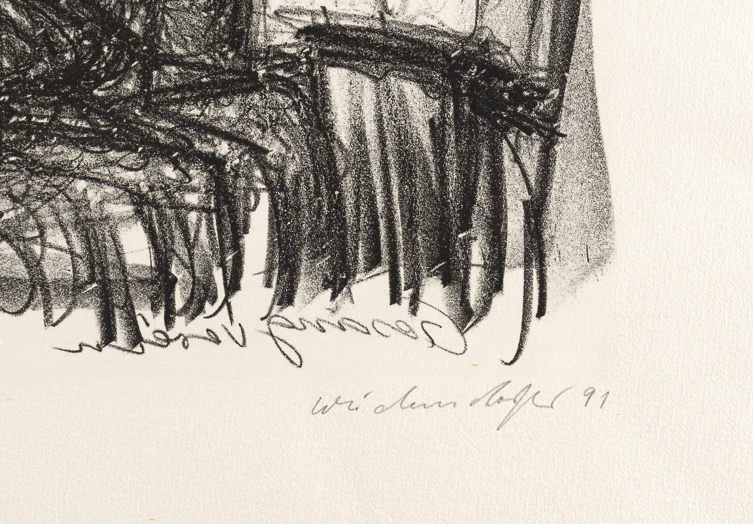 1991. Lithografie / Kreidelithografie, in Schwarz, auf schwerem gelbem Hahnemühle-Bütten. – Originale Künstlergrafik, von Claus Weidensdorfer. – Auflage Exemplar Nr. 50/50. – 39,2 x 25,3 cm (Darstellung / Druckbild), 41 x 26 cm (Stein), 54 x 40 cm (Blatt).