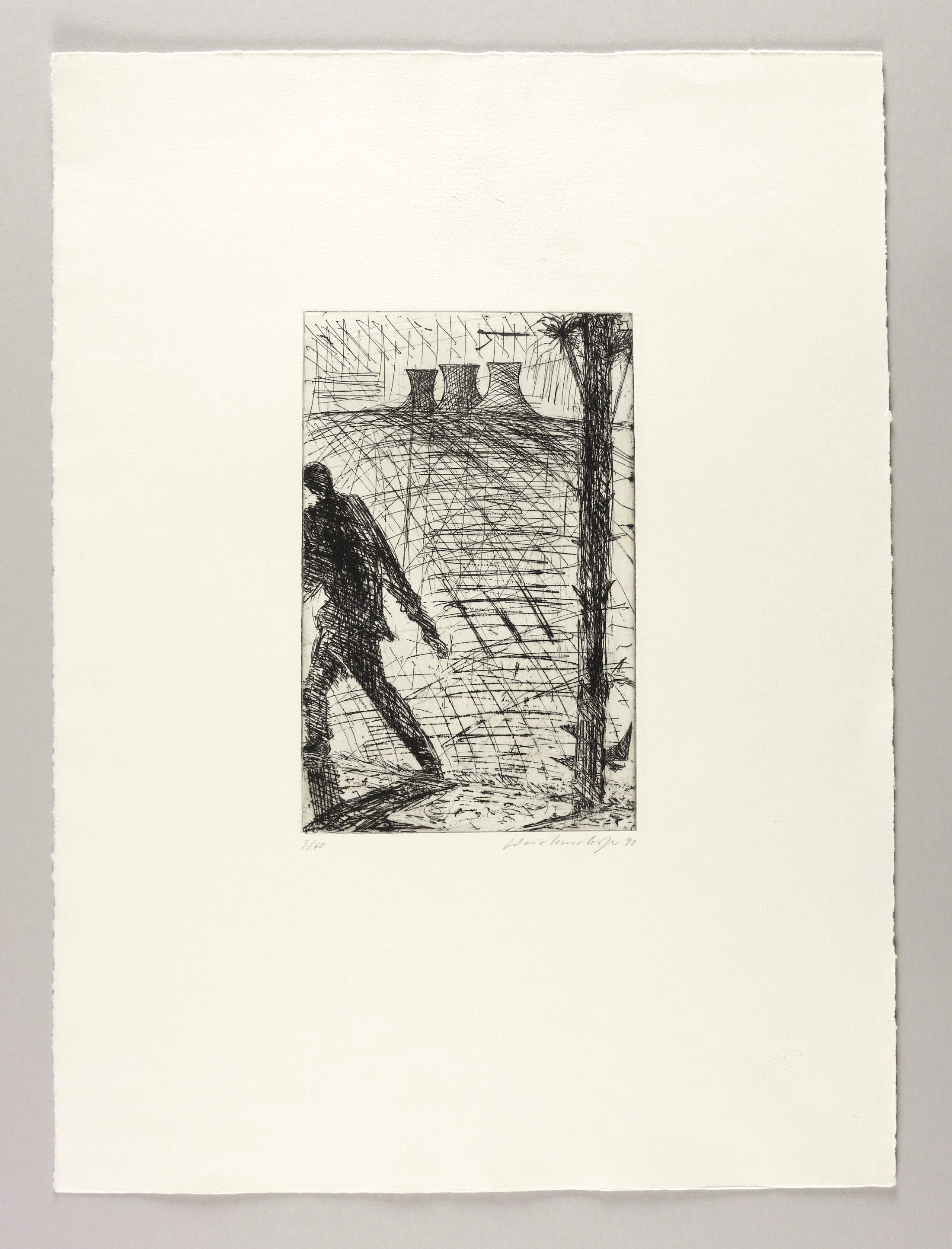 1990. Radierung / Strichätzung, in Schwarz, auf hellgelbem Velinkarton. – Originale Künstlergrafik, von Claus Weidensdorfer. – Auflage Exemplar Nr. 3/60. – 24,5 x 15,7 cm (Darstellung / Platte), 54 x 40 cm (Blatt).
