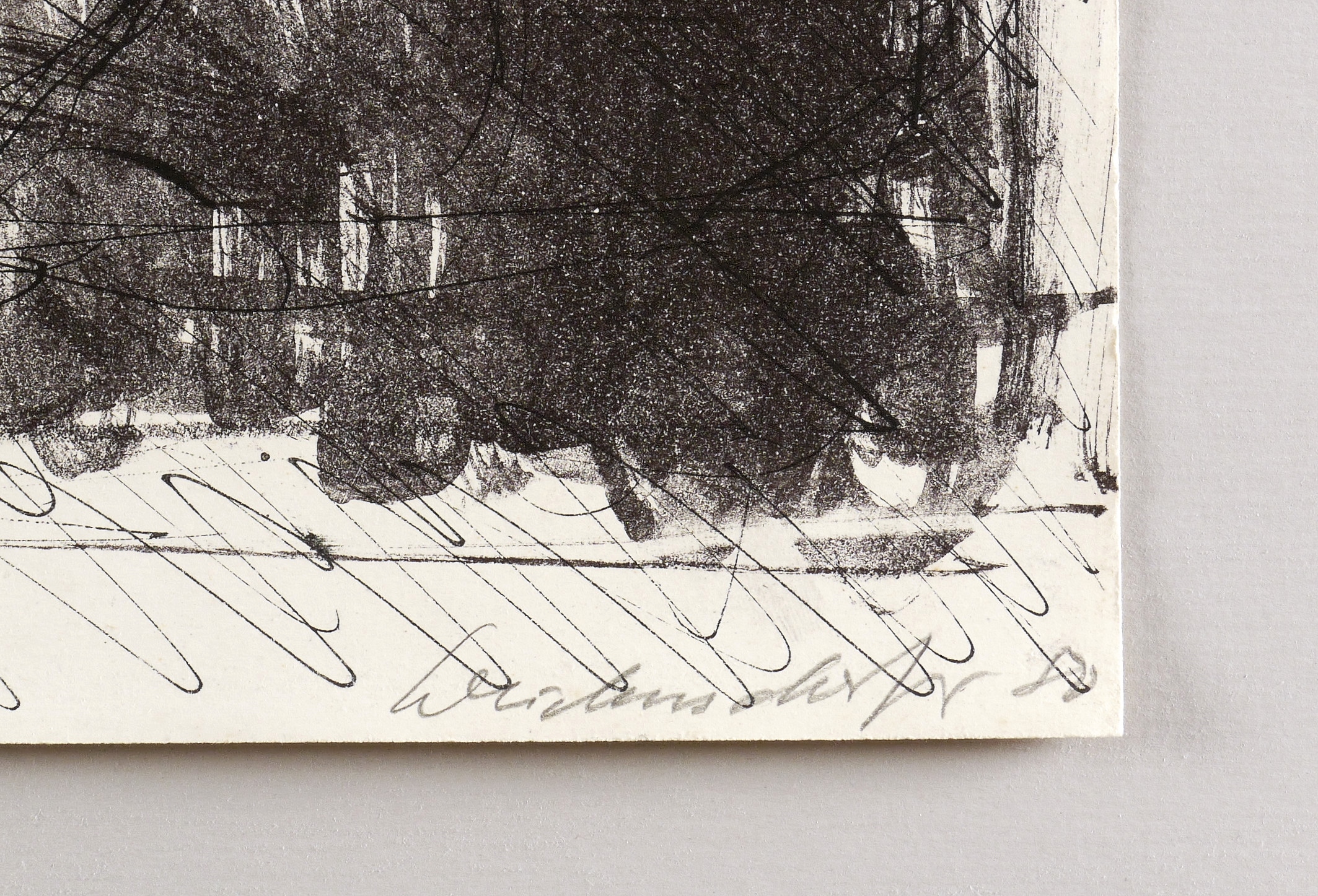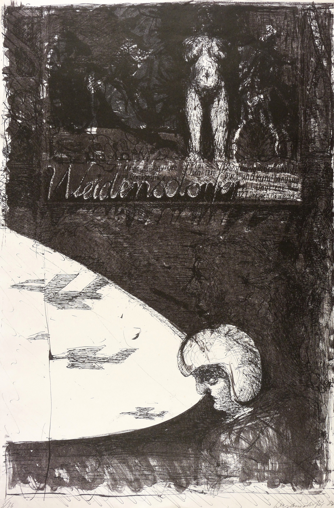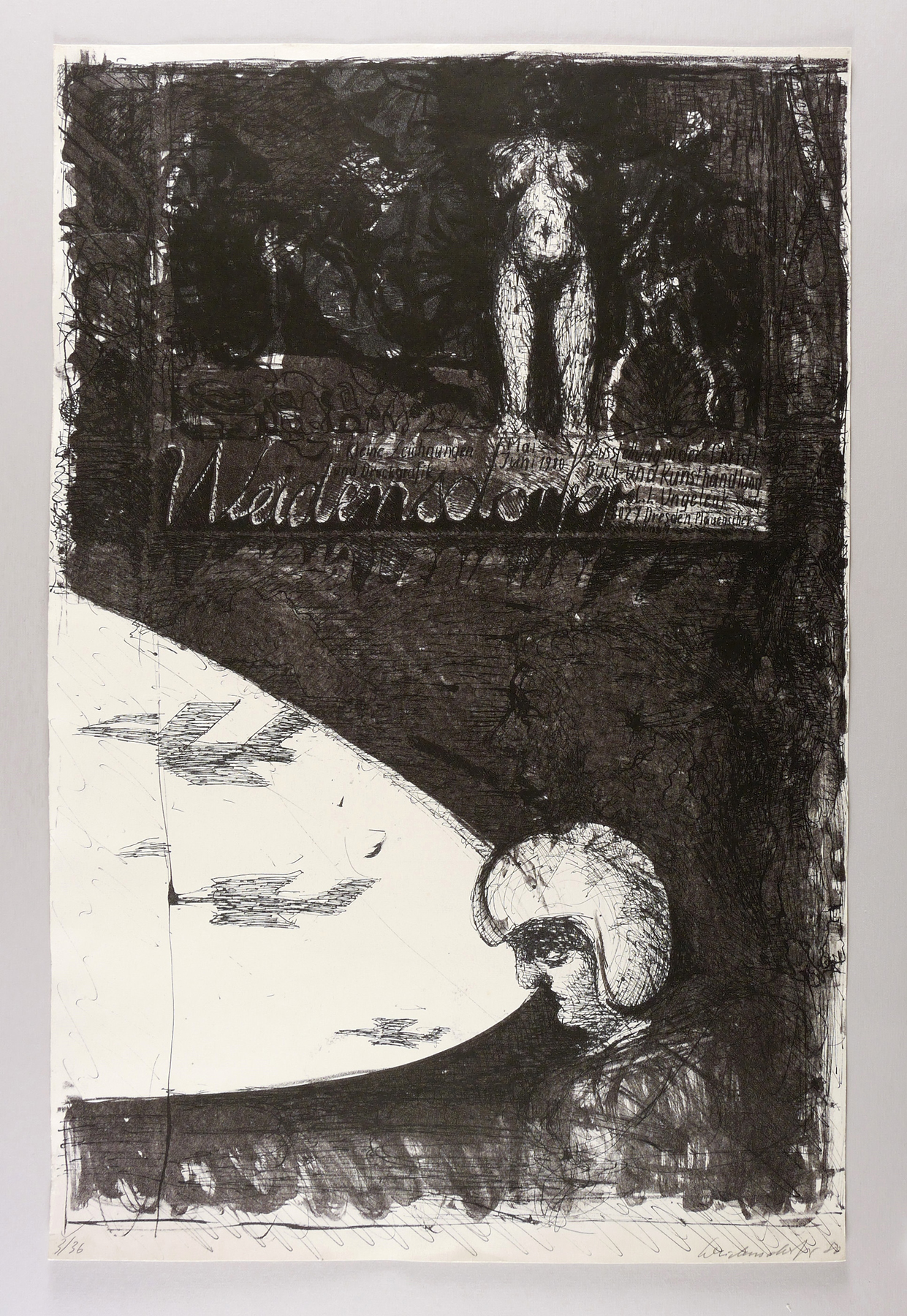 Muschter 290. – In Bleistift rechts unten signiert und datiert: ″Weidensdorfer 80″. Links Auflagenbezeichnung: ″3/36″. Im Stein oben Inschrift: ″Kleine Zeichnungen und Druckgrafik Weidensdorfer (...)″. – Randloser Druck. - Originalgrafisches Künstlerplakat zur Ausstellung ″Weidensdorfer. Kleine Zeichnungen und Druckgrafik″ Mai-Juni 1980 in der Christlichen Buch- und Kunsthandlung Ungelenk in Dresden. - Die Angaben im Werkverzeichnis etwas abweichend (WVZ Muschter, S. 91). – In den Blattkatenn unscheinbare Mängel. Insgesamt guter Zustand.