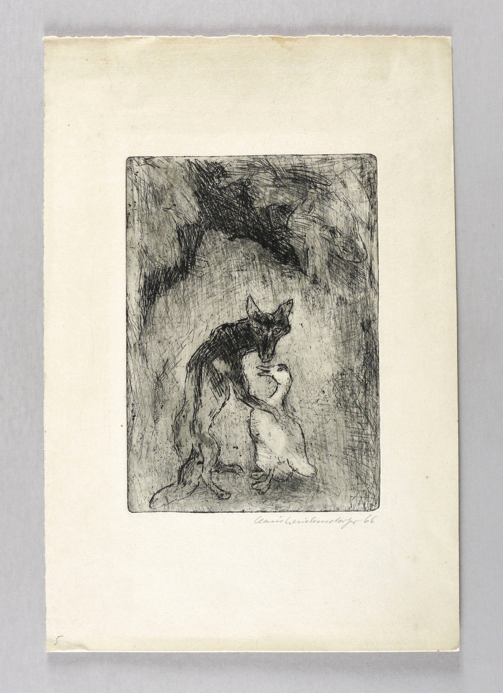 Muschter 907. – Rechts unten in Bleistift signiert und datiert: ″Claus Weidensdorfer 66″. Verso bezeichnet. – Nicht das Blatt ″Der Fuchs und die Gans″ (WVZ Muschter 111, dort anderes Jahr 1967 und andere Größe mit 17,6 x 10,8 cm). – Blattecke links unten bestoßen. Oberer Blattrand etwas gebräunt. Sonst guter Zustand.