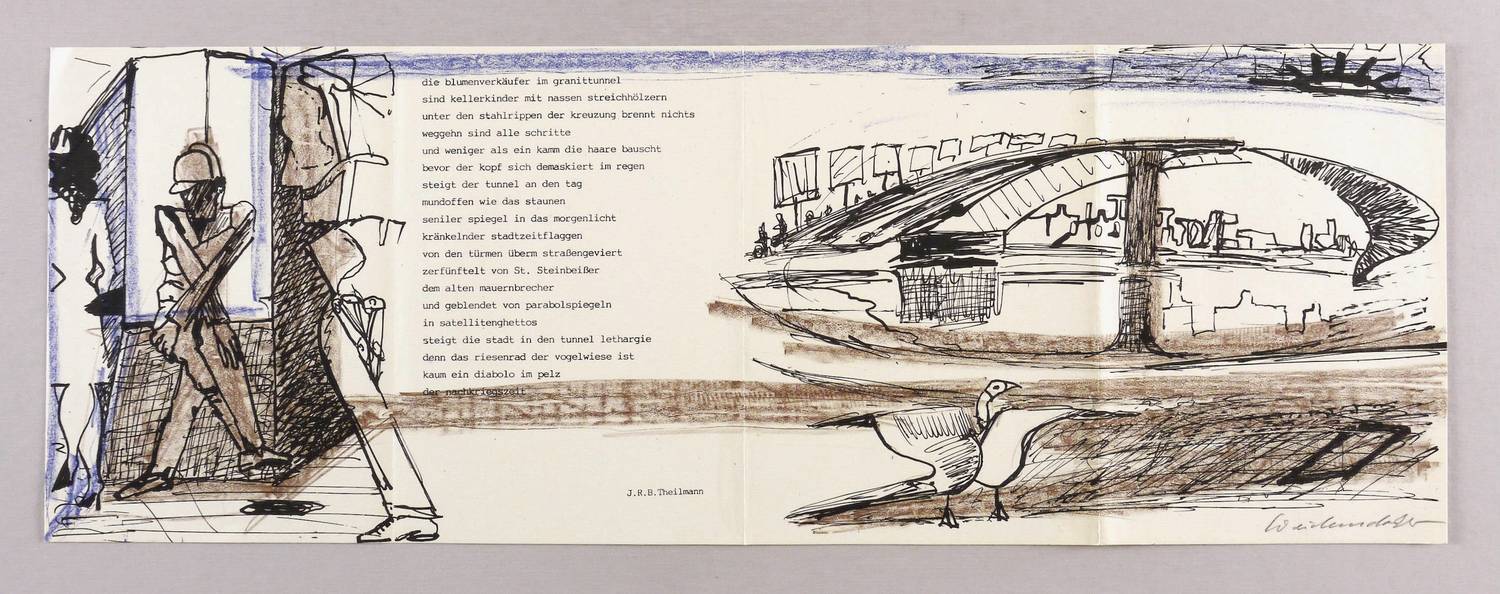 Rechts unten in Bleistift signiert: ″Weidensdorfer″. Im Druck Gedichttext: ″die blumenverkäufer im granittunnel / sind kellerkinder mit nassen streichhölzern / unter den stahlrippen der kreuzung brennt nichts / (...)″. – Originalgrafische vierteilige Klappkarte. Randloser Druck. – 3 originale vertikale Faltungen. Geringe Lagerspuren. Guter Zustand.