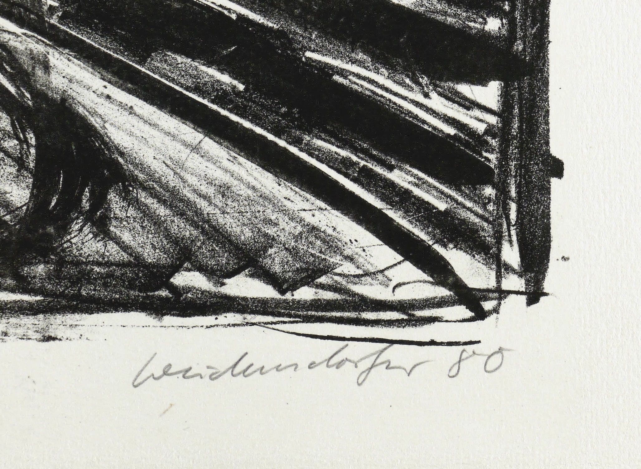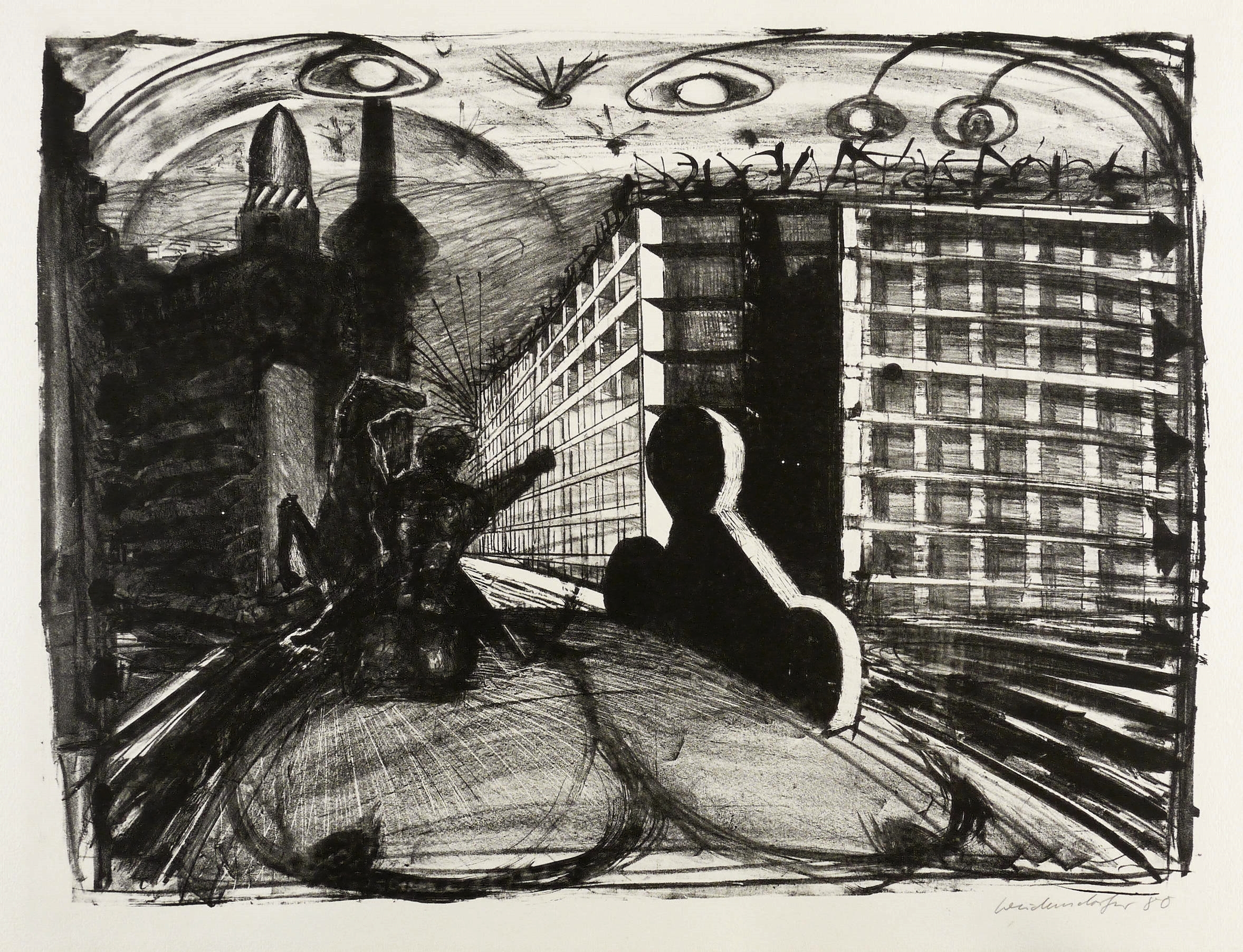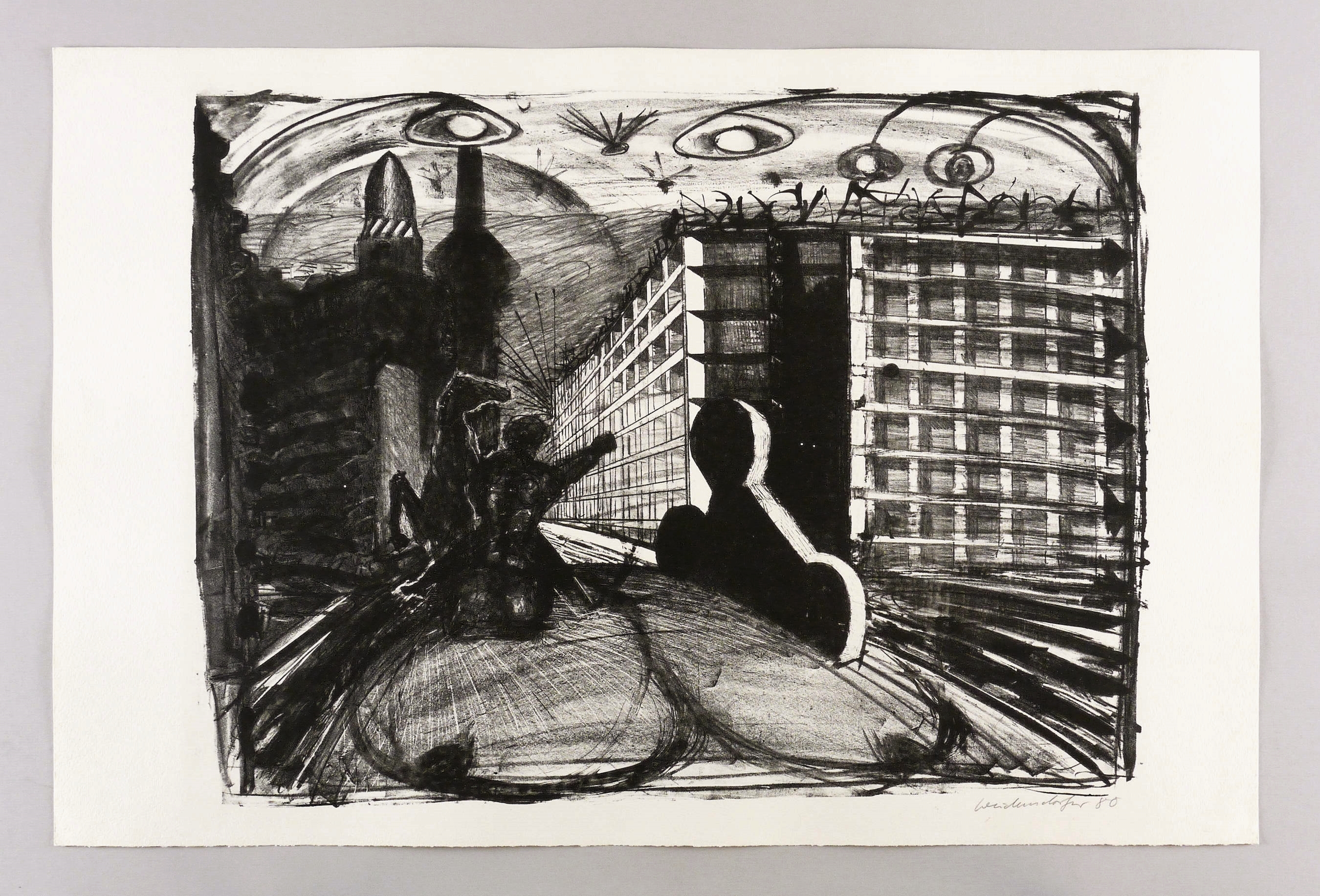 1980. Lithografie / Kreide- & Pinsellithografie, partiell geschabt, in Schwarz, auf hellchamois Hahnemühle. – Originale Künstlergrafik, von Claus Weidensdorfer. – Zustandsdruck. – 45,0 x 60,0 cm (Darstellung / Druckbild), 51 x 76 cm (Blatt).