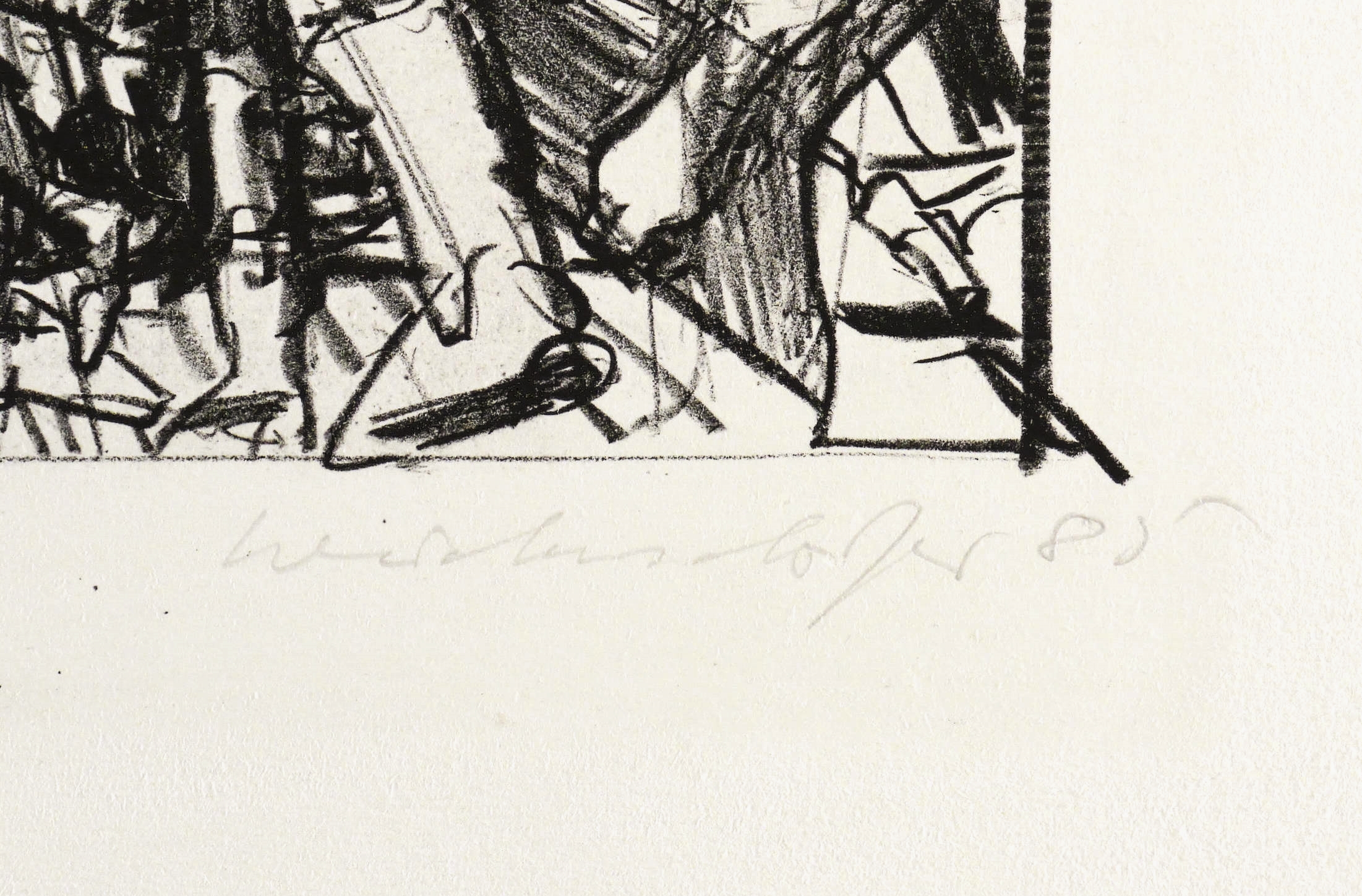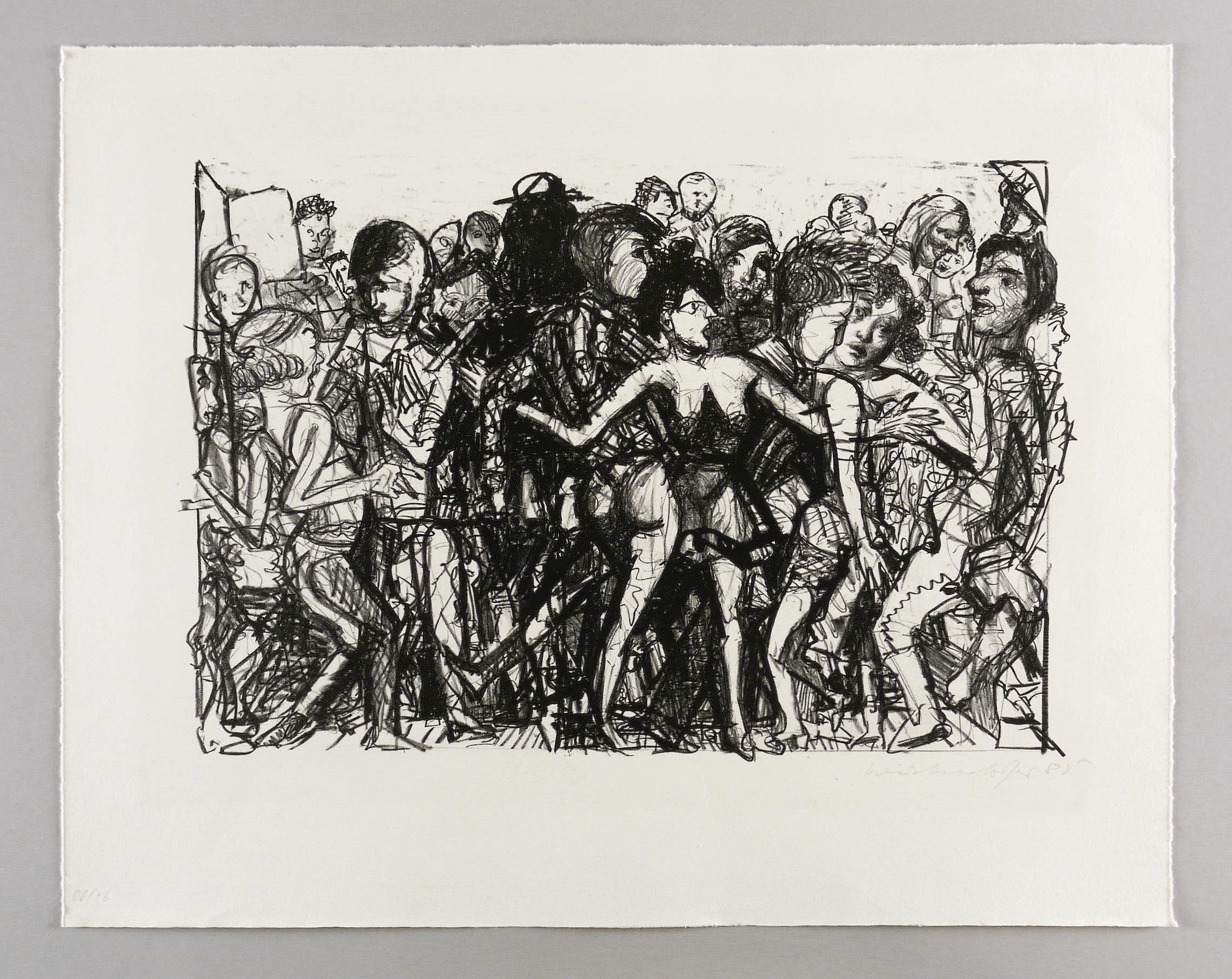 1985. Lithografie / Kreidelithografie, in Schwarz, auf hellchamois Velin. – Originale Künstlergrafik, von Claus Weidensdorfer. – Auflage Exemplar Nr. 0/16 (Druckerexemplar). – 35,0 x 52,5 cm (Darstellung / Druckbild), 52 x 65 cm (Blatt).