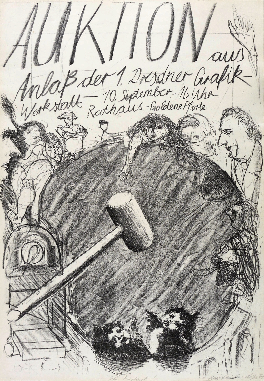 Muschter 247. – In Bleistift rechts unten signiert und datiert: ″Claus Weidensdorfer 77″. Mittig Widmung. Diverse Inschriften. – Originalgrafisches Künstlerplakat zur Auktion der 1. Dresdner Grafikwerkstatt. Erschienen in einer Auflage von 50 Exemplaren. – Provenienz: Michael Wackwitz, Steindrucker Dresden/Stuttgart. – Sehr guter Zustand.