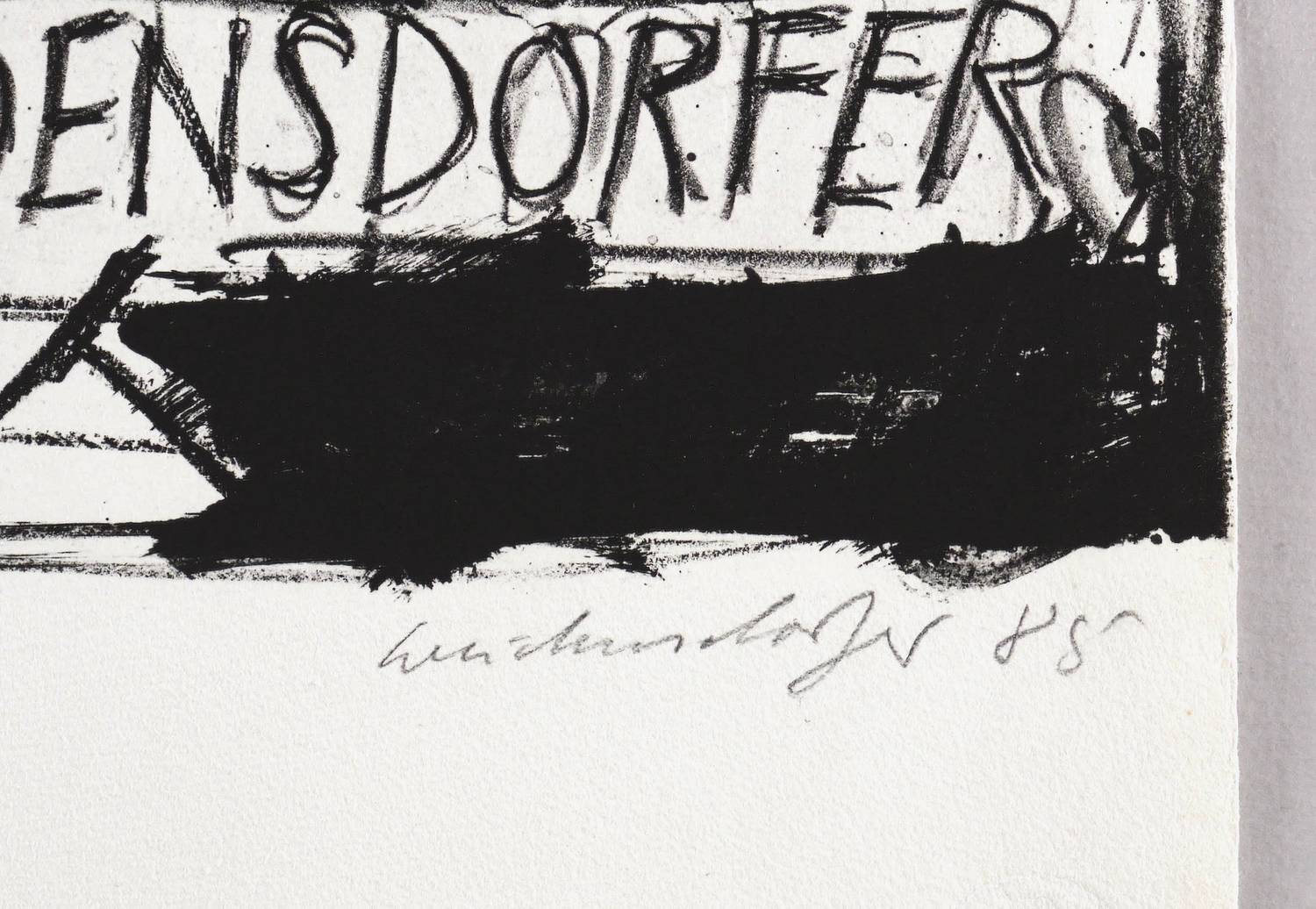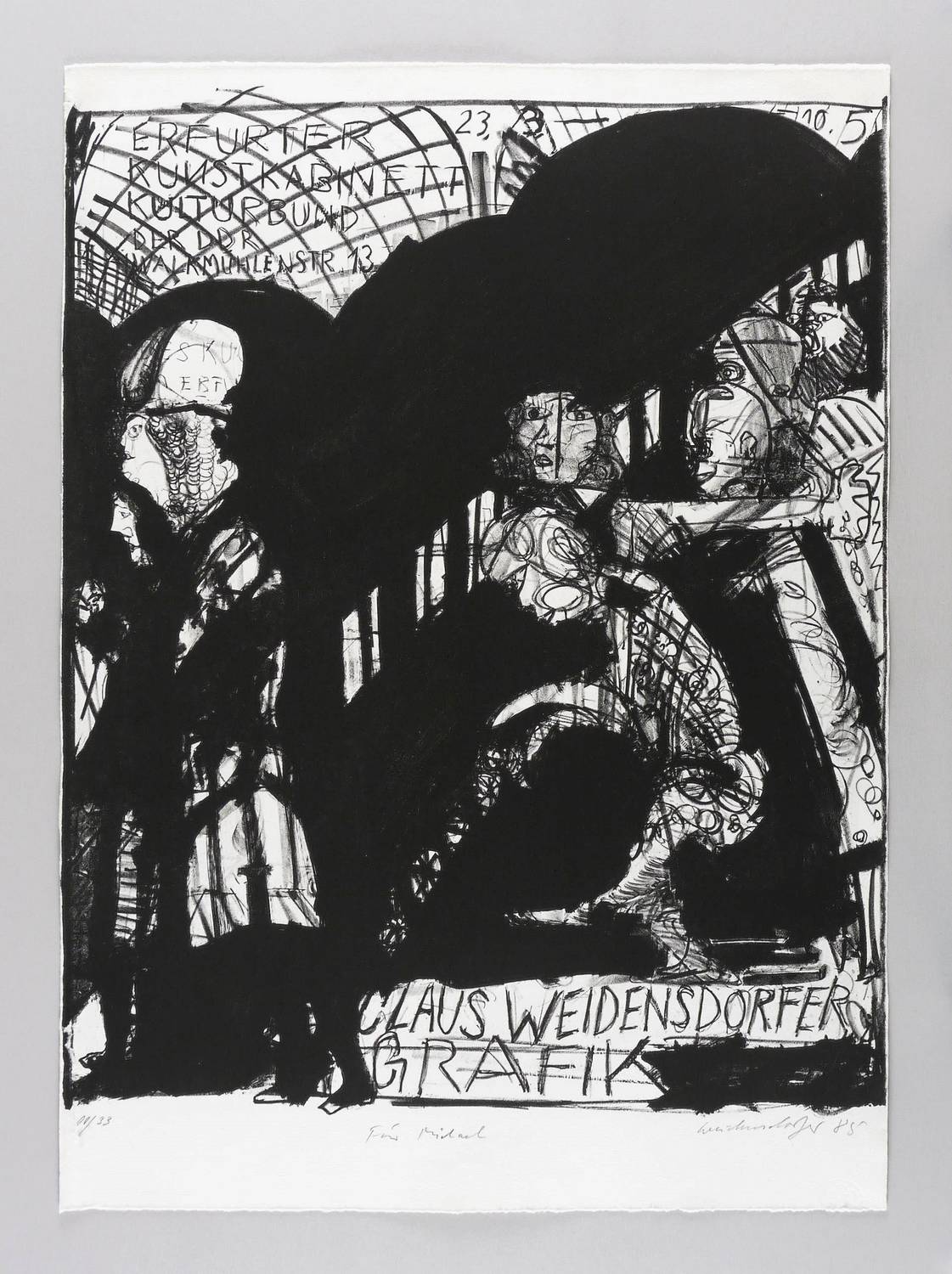 Muschter 506. – In Bleistift rechts unten signiert und datiert: ″Weidensdorfer 85″. Links Auflagenbezeichnung: ″00/33″. Mittig Widmung. Im Stein oben diverse Inschriften. Wasserzeichen der Hahnemühle. – Originalgrafisches Künstlerplakat zur Ausstellung ″Claus Weidensdorfer. Grafik″ 23.3.-10.5.1985 im Kunstkabinett in Erfurt. – Oben und seitlich randloser Druck. – Blattrand links unten mit hinterlegter Partie. Mäßig guter Zustand.