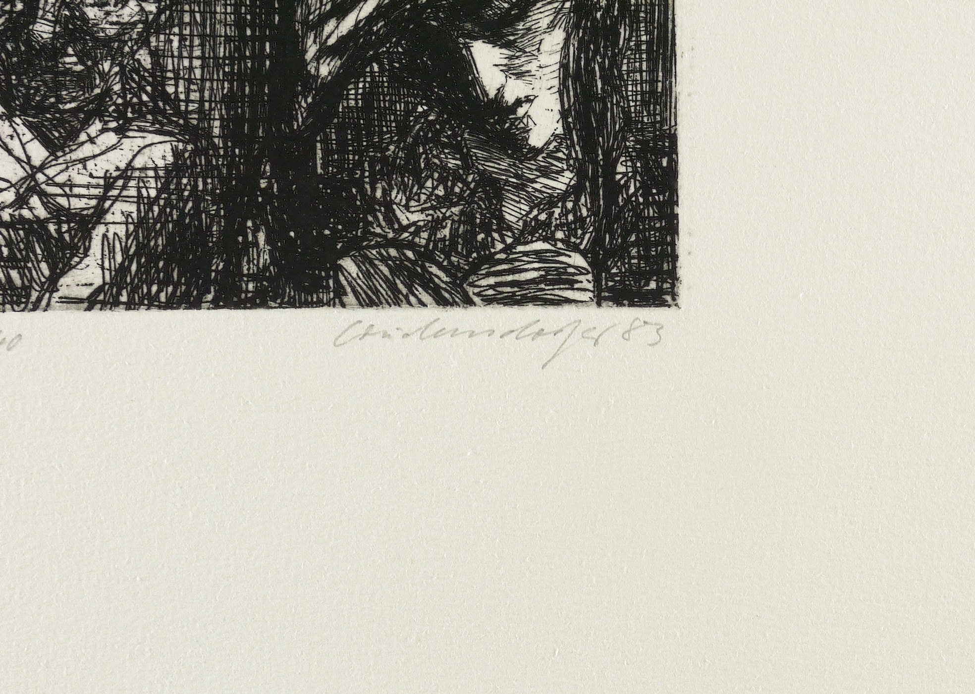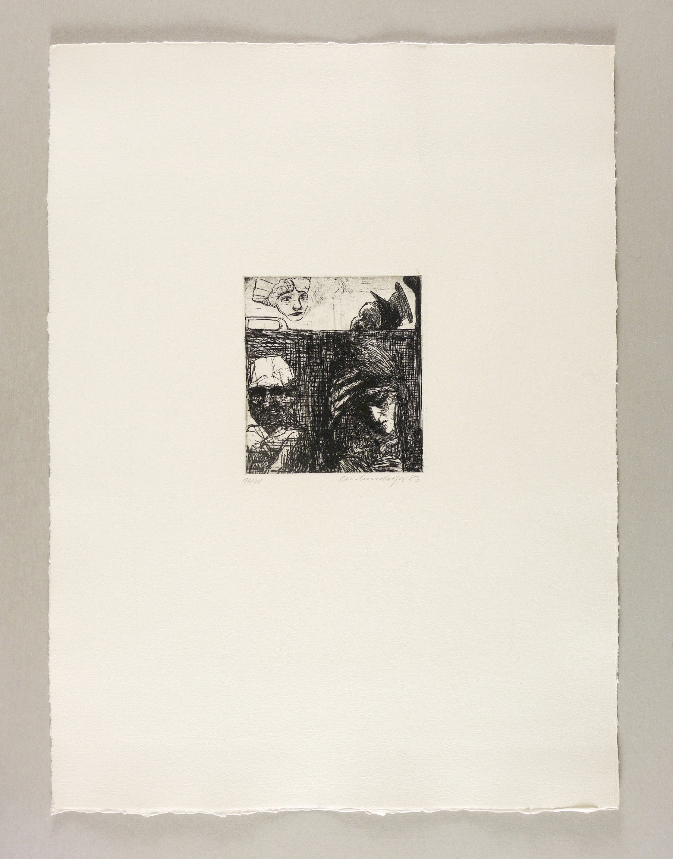 1983. Radierung / Strichätzung, in Schwarz, auf schweren hellchamois Bütten. – Originale Künstlergrafik, von Claus Weidensdorfer. – Auflage Exemplar Nr. 14/40. – 13,6 x 12,2 cm (Darstellung / Platte), 54 x 40 cm (Blatt).