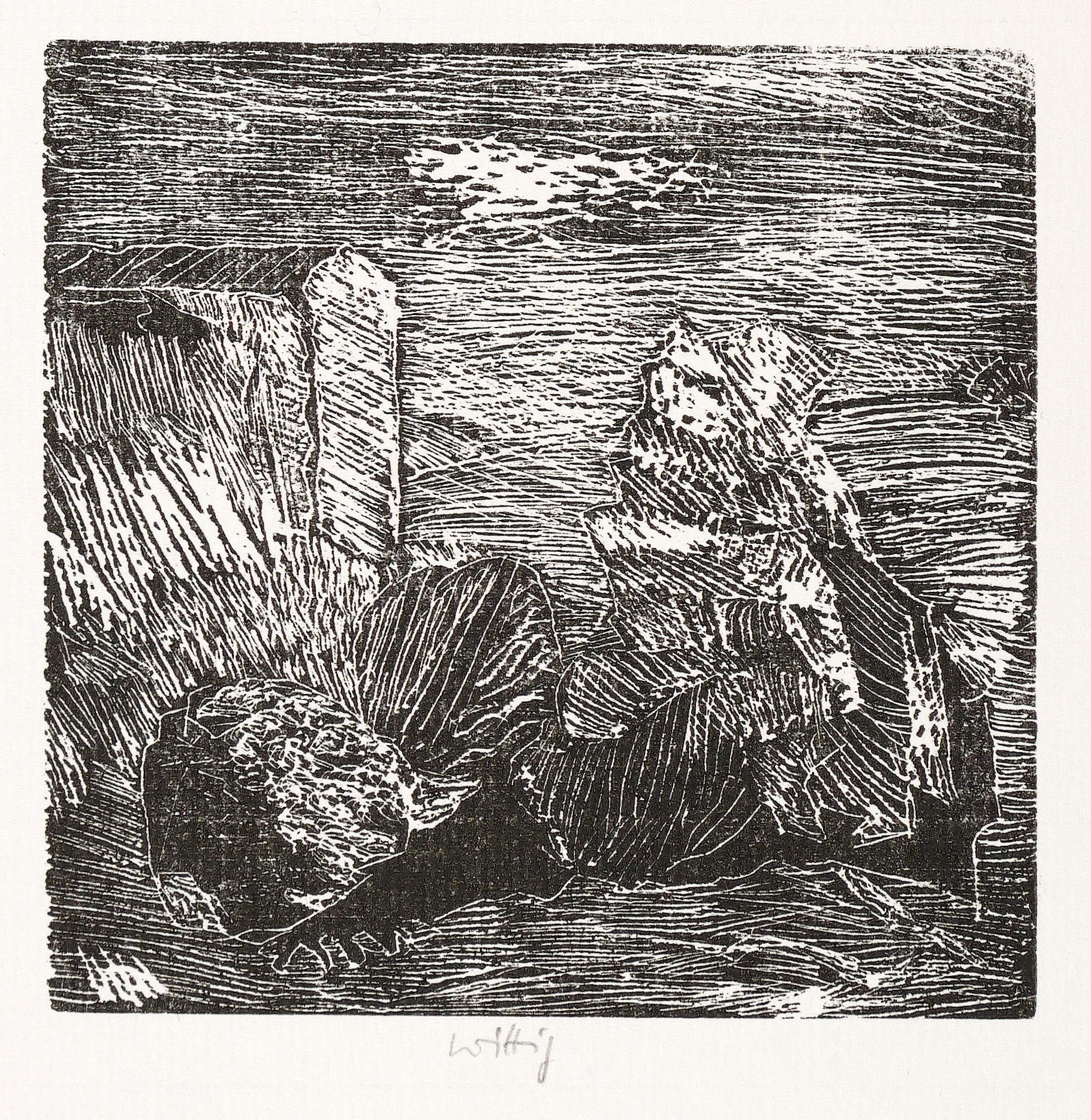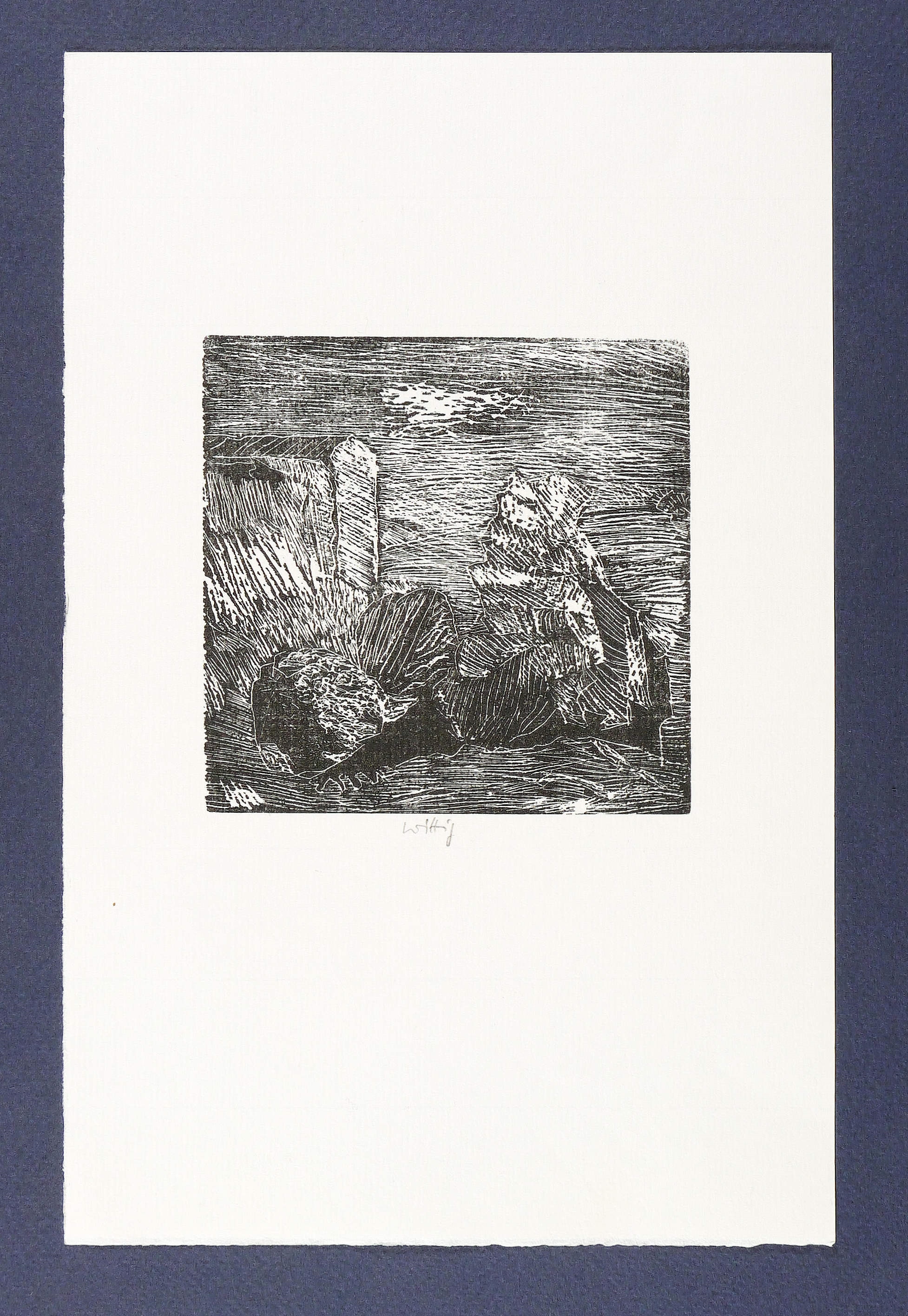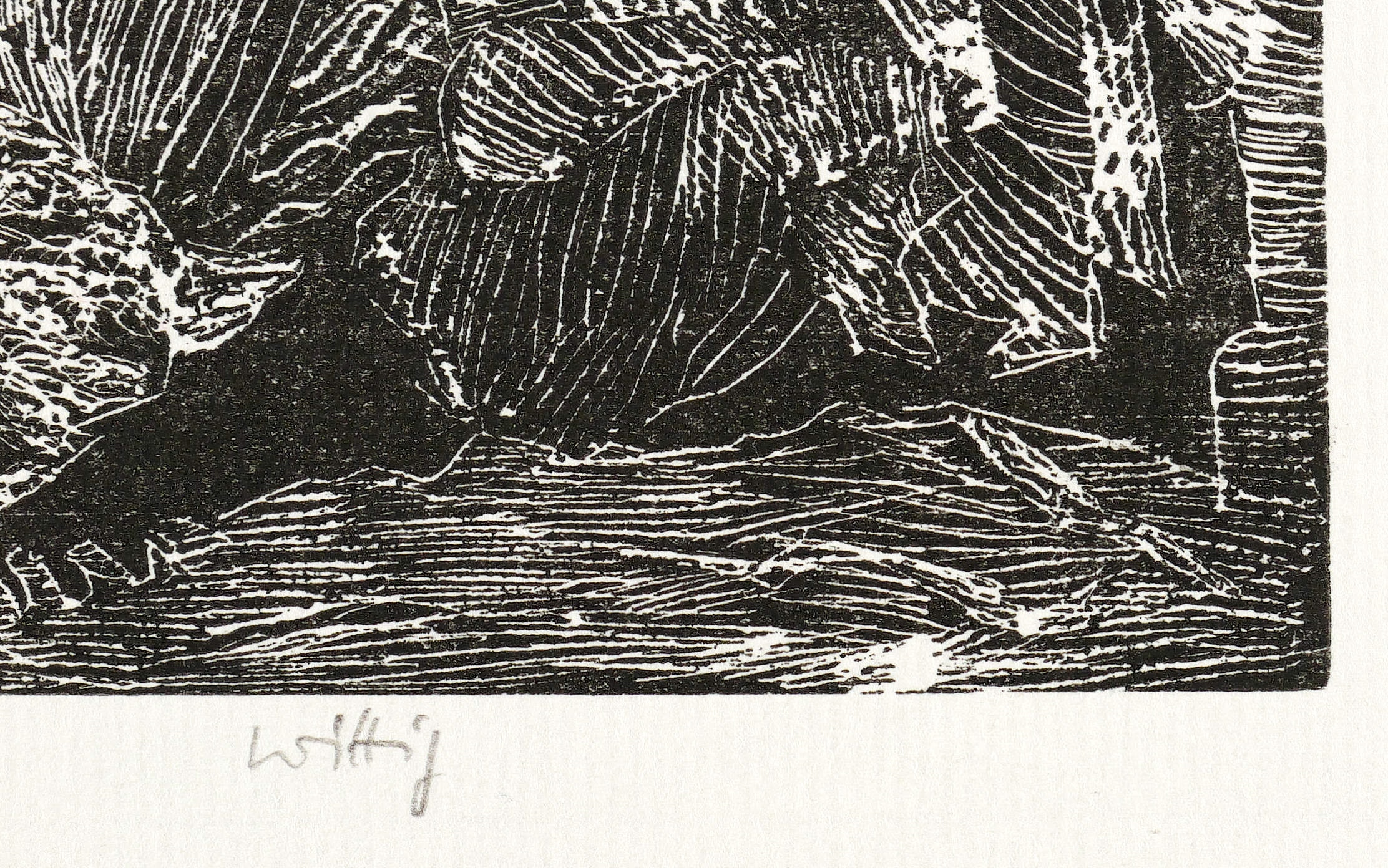 Um 1990. Holzriss, in Schwarz, auf weißlichem Büttenpapier. – Originale Künstlergrafik, von Werner Wittig. – 9,8 x 10,0 cm (Darstellung / Druckstock), 24,5 x 16 cm (Blatt).