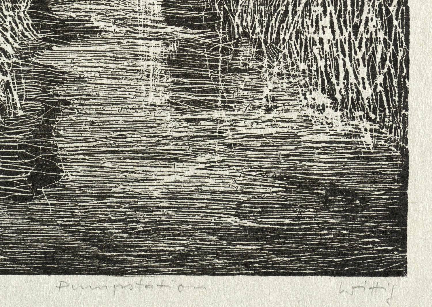 1982/1983. Holzriss / Holzriß, in Schwarz, auf rauem gelblichem Japan. – Originale Künstlergrafik, von Werner Wittig. – Auflage Exemplar Nr. 10/25. – 18,9 x 17,7 cm (Darstellung / Druckstock), 29,5 x 21 cm (Blatt).