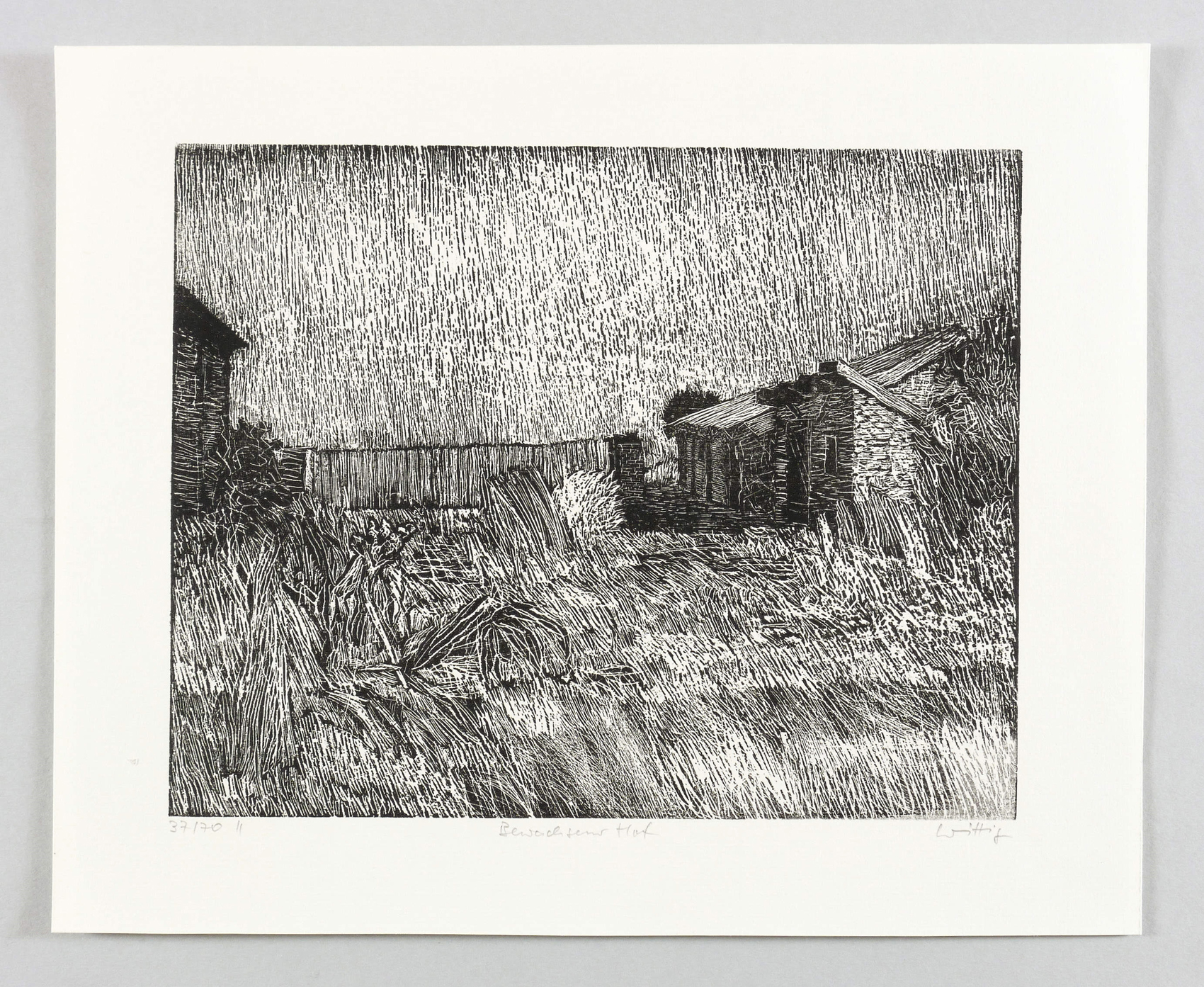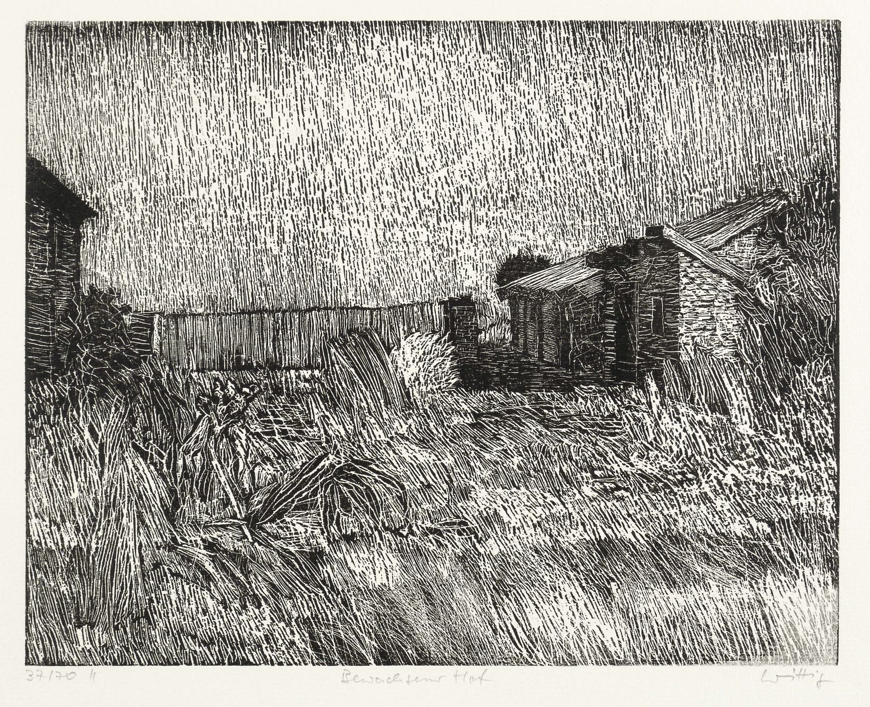 Reinhardt (2000) 132. Reinhardt (1993) 260. – Rechts unten in Bleistift signiert: ″Wittig″. Links Auflagenbezeichnung: ″37/70 II″. Mittig Titel: ″Bewachsener Hof″. Verso Stempel der Plauener Grafikgemeinschaft. – Sehr guter Zustand.