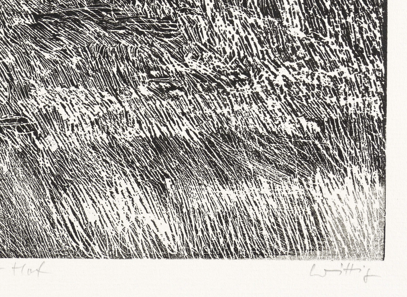 1983. Holzriss, in Schwarz, auf hellchamois Achat-Maschinenbütten. – Originale Künstlergrafik, von Werner Wittig. – Auflage Exemplar Nr. 37/70. – 19,8 x 25,0 cm (Darstellung / Druckstock), 26 x 32 cm (Blatt).