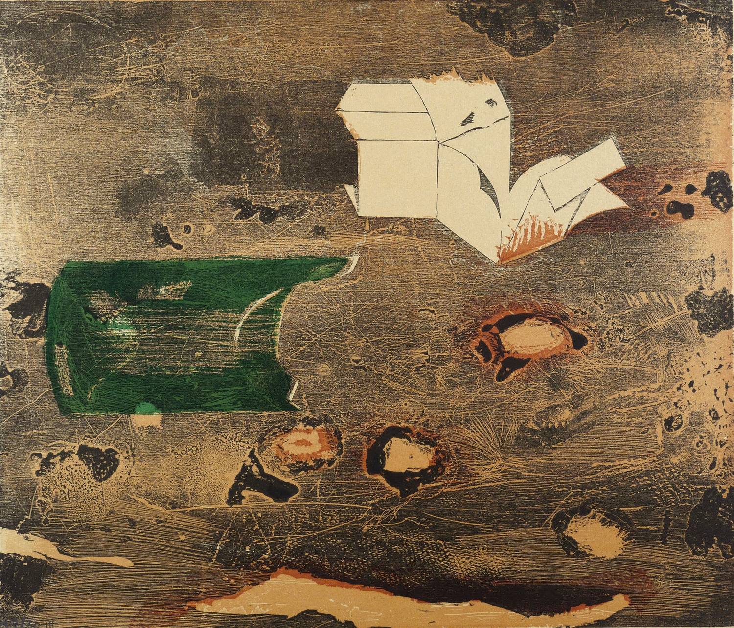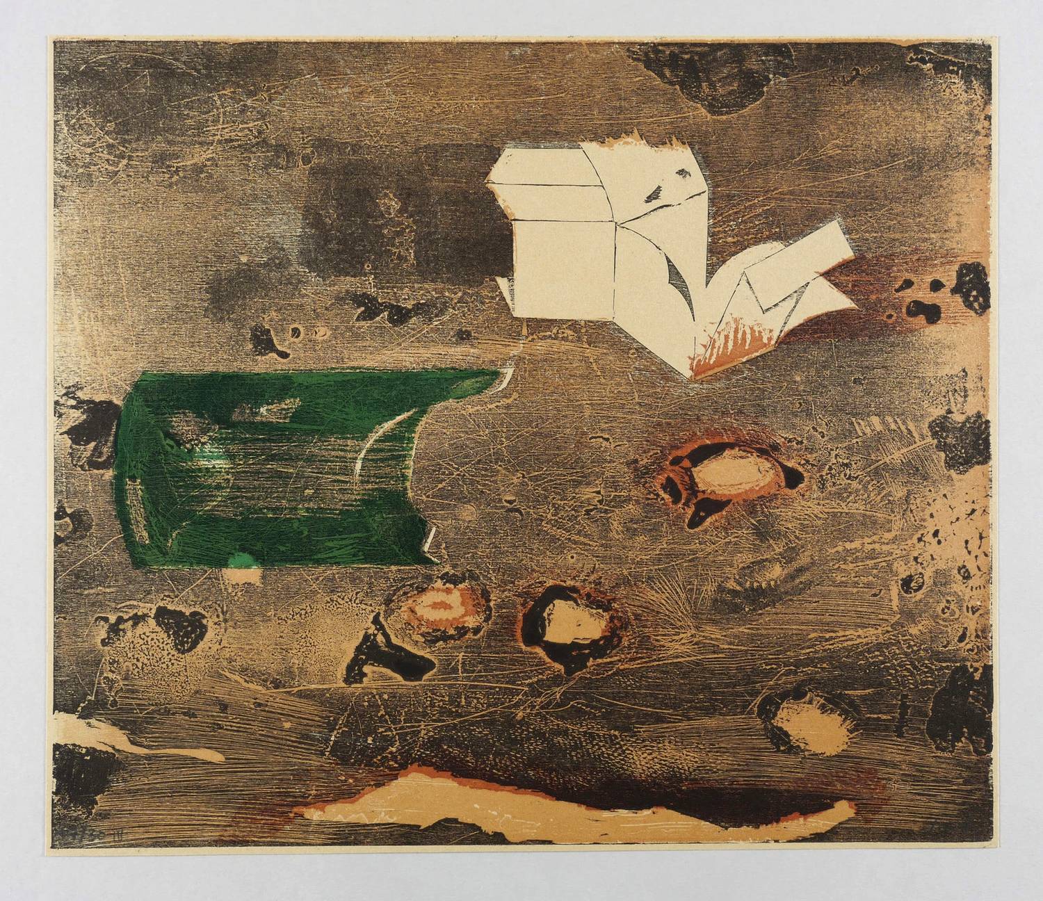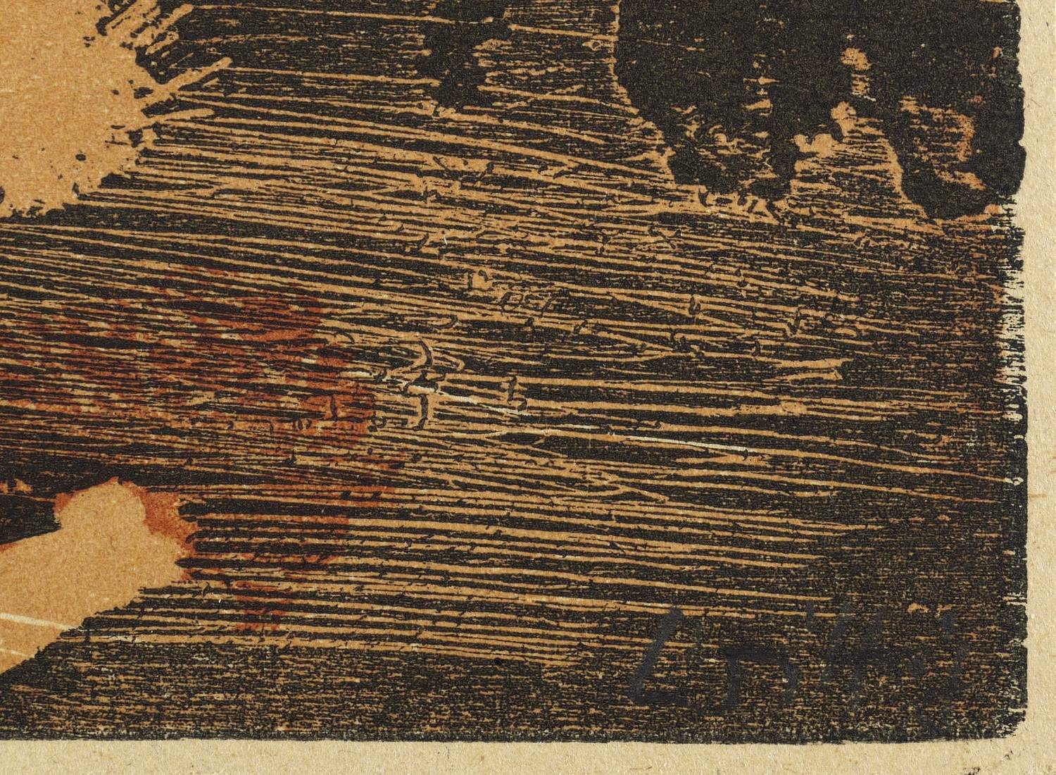 1979. Farbholzriss, in 3 Farben, auf hellbraunem Karton. – Originale Künstlergrafik, von Werner Wittig. – Auflage Exemplar Nr. 17/30. – 33,4 x 39,0 cm (Darstellung), 34,1 x 39,5 cm (Blatt).