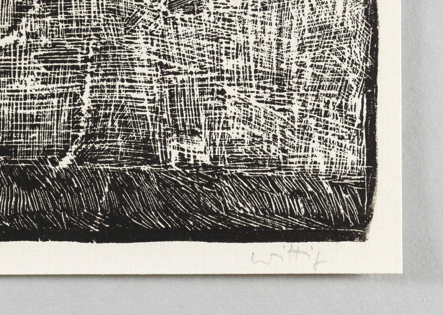 1972. Holzriss / Holzriß, in Schwarz, auf rauem weißem Maschinenbütten. – Originale Künstlergrafik, von Werner Wittig. – Auflage 60 Exemplare. – 19,8 x 21,1 cm (Darstellung / Druckstock), 21,5 x 22 cm (Blatt).