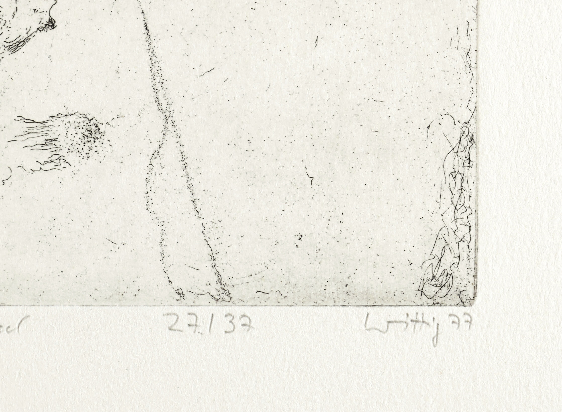 1977. Radierung / Strichätzung, mit Plattenton, in Schwarz, auf weißem Büttenkarton. – Originale Künstlergrafik, von Werner Wittig. – Auflage Exemplar Nr. 27/37. – 13,0 x 13,0 cm (Darstellung / Platte), 30 x 23 cm (Blatt).
