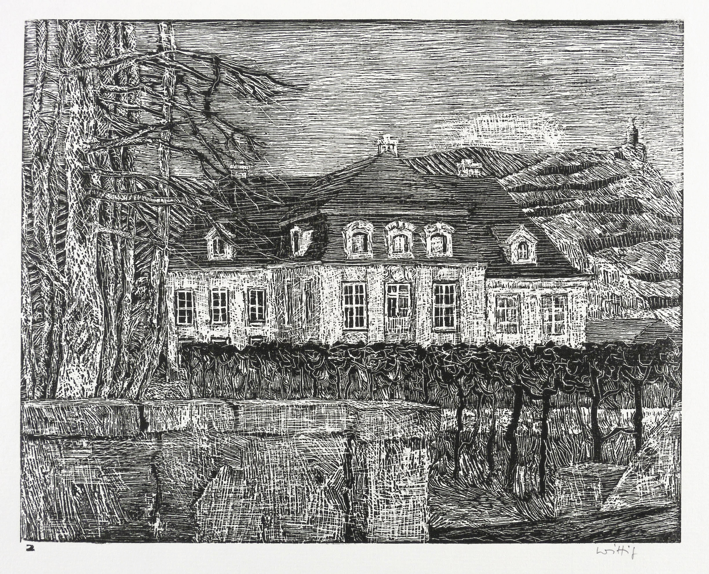 Werner Wittig (1930 Chemnitz - 2013 Radebeul). Deutscher Maler und Grafiker. 1952-57 Studium der Grafik an der HfbK Dresden bei Erich Fraaß, Hans Theo Richter und Max Schwimmer. Freundschaft mit Claus Weidensdorfer. 1957 Aufnahme in den Verband Bildender Künstler der DDR. Zahlreiche Einzelausstellungen z.B. in der Galerie Kühl in Dresden. Hans-Theo-Richter-Preis der Sächsischen Akademie der Künste in Dresden. Landschaft und Stillleben sind die zwei Hauptthemen des Künstlers, die meist mittels des Holzrisses oder Farbholzrisses umgesetzt werden. Typisch dabei sind die sichtbaren natürlichen Strukturen des Holzes, die, eingearbeitet in die Komposition, den Grafiken eine organische Lebendigkeit verleihen.