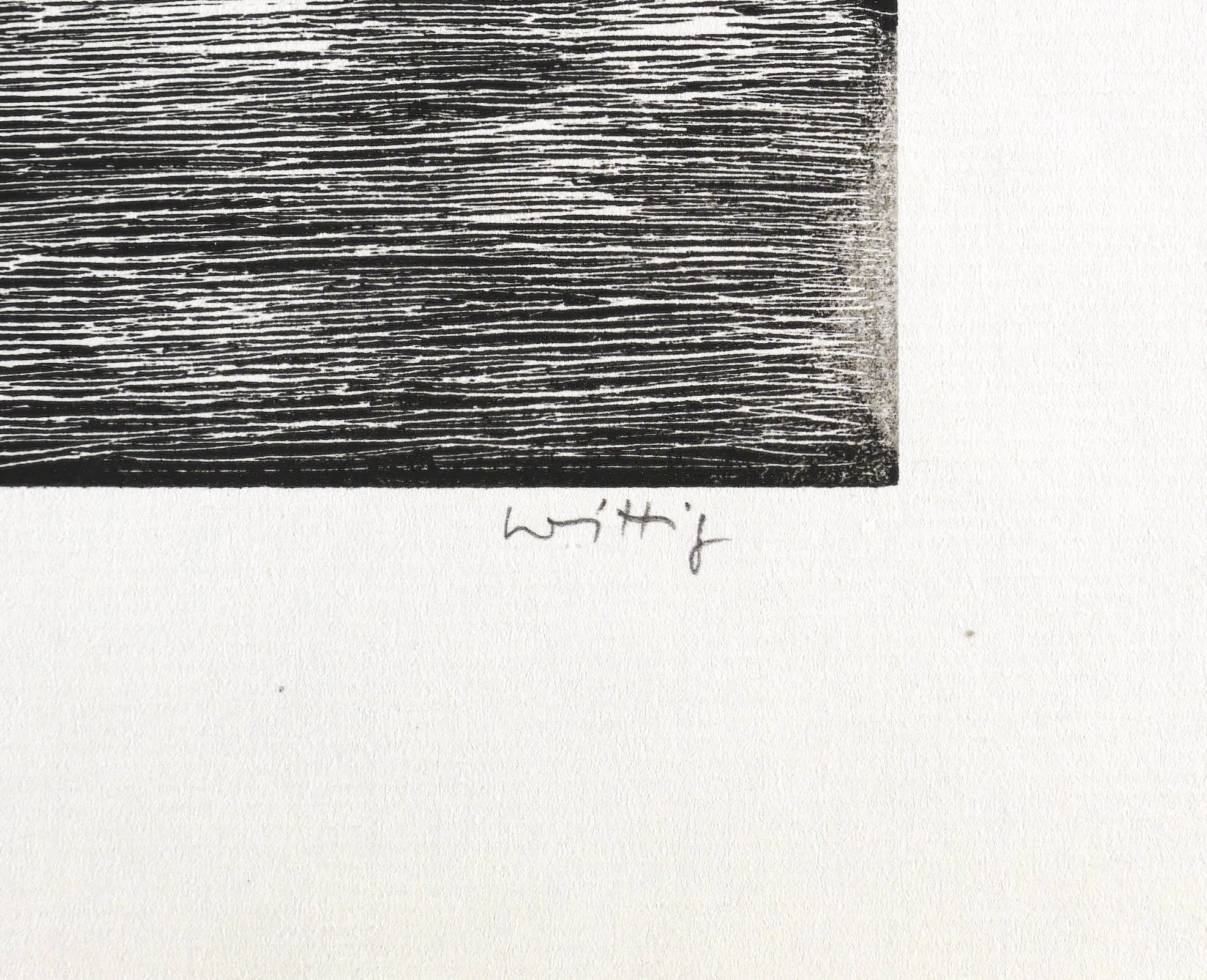 1973. Holzriss / Holzriß, in Schwarz, auf rauem hellchamois Maschinenbütten. – Originale Künstlergrafik, von Werner Wittig. – Auflage 40 Exemplare. – 20,0 x 24,9 cm (Darstellung / Druckstock), 29 x 36 cm (Blatt).