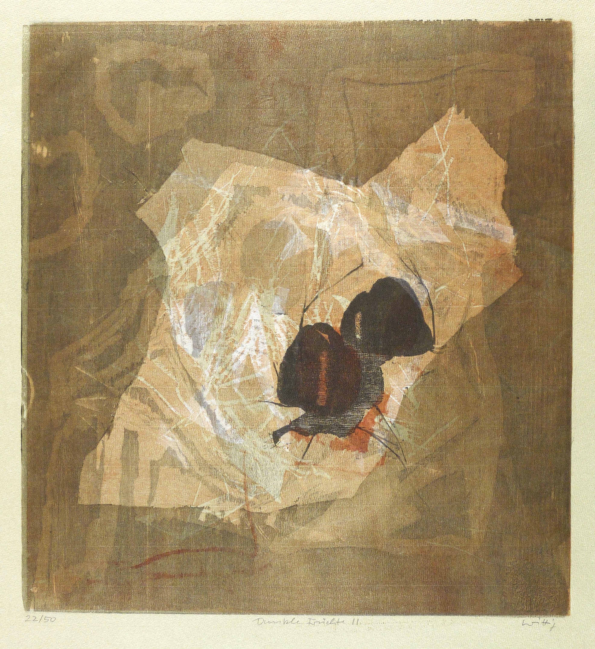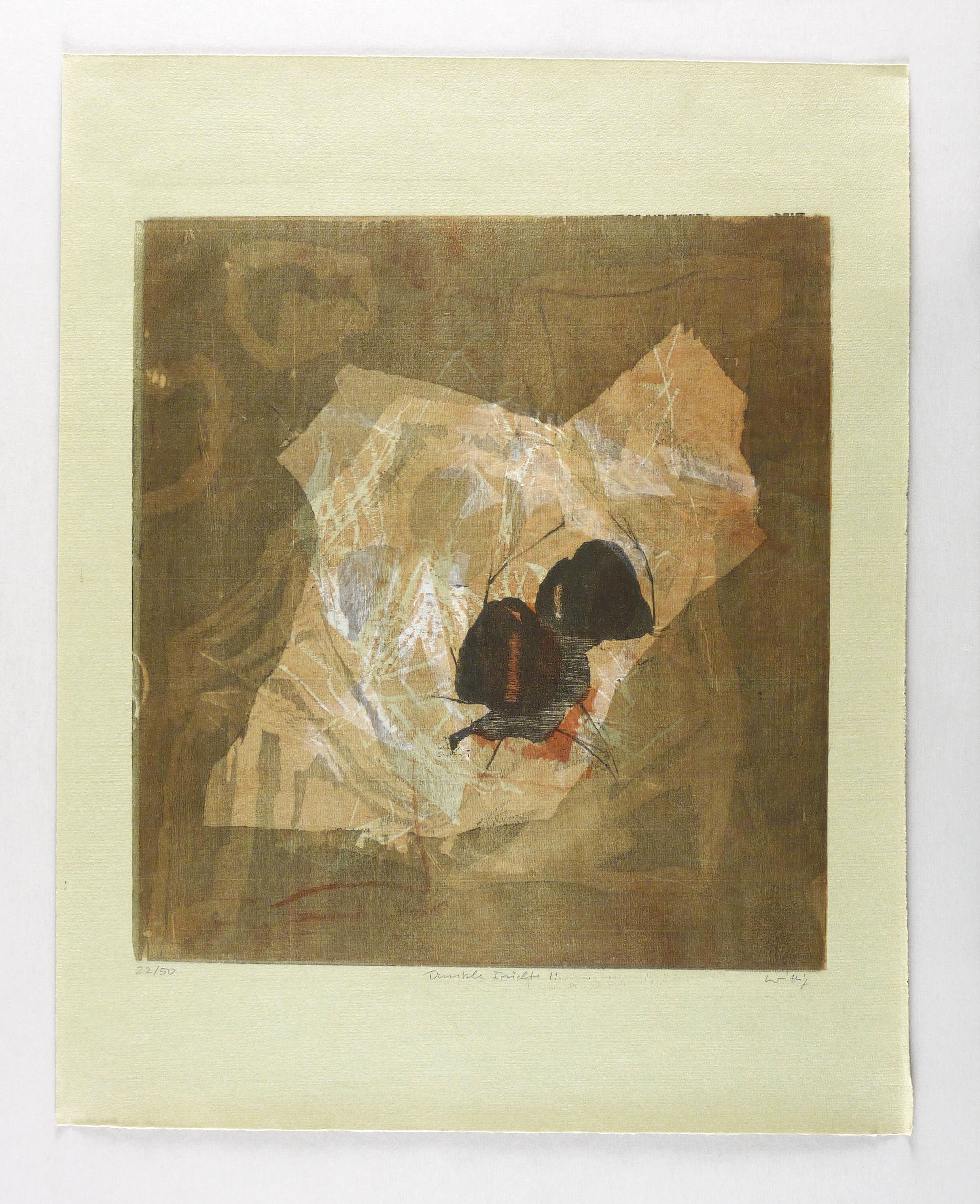 Reinhardt (2000) 164 II b (von b). Reinhardt (1993) 301 I b (von b). – Rechts unten in Bleistift signiert: ″Wittig″. Links Auflagenbezeichnung: ″22/50″. Mittig Titel: ″Dunkle Früchte II″. Wasserzeichen der Hahnemühle. – Originalrandiges Exemplar. Tadellos erhalten. Sehr guter Zustand.