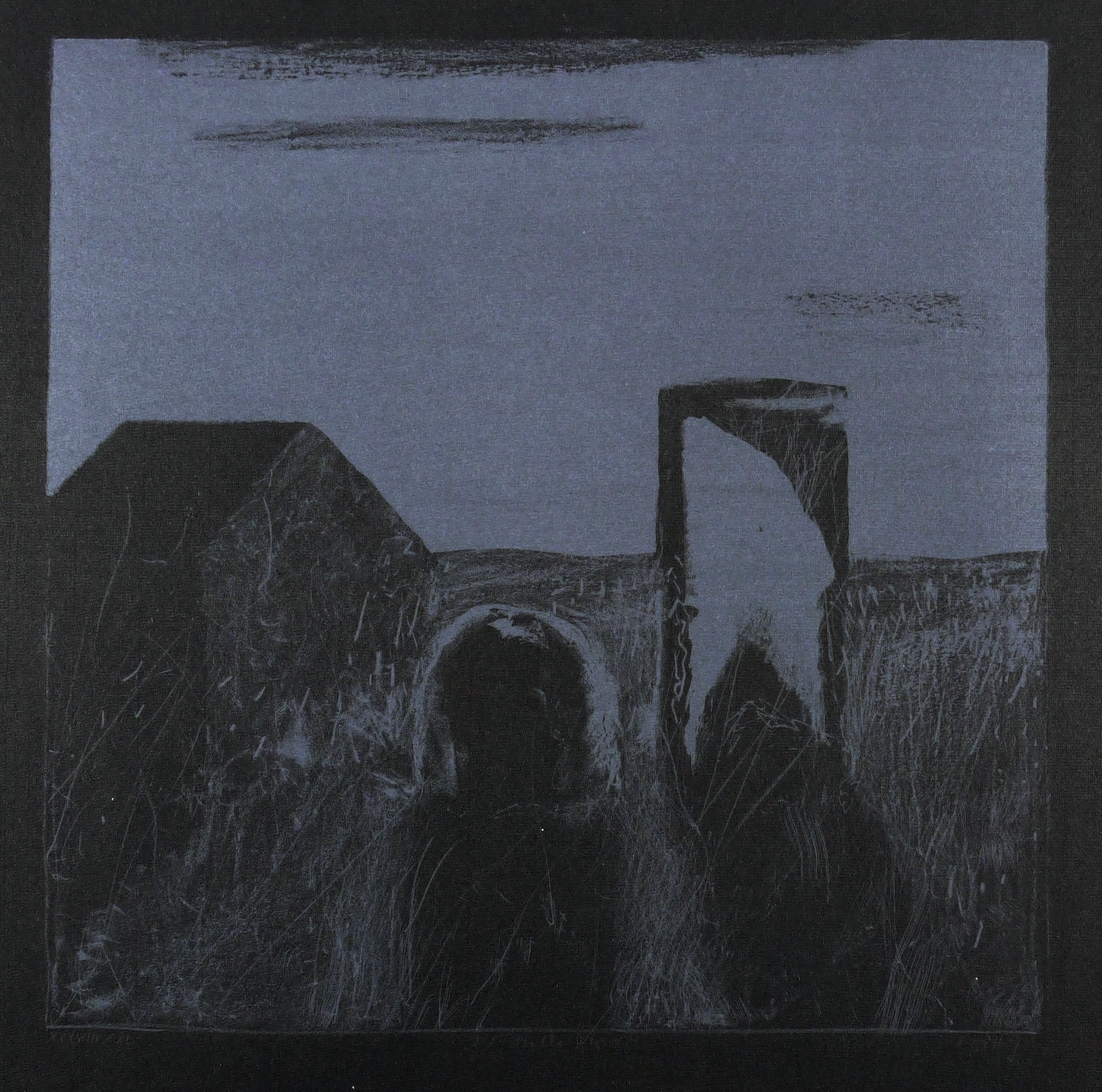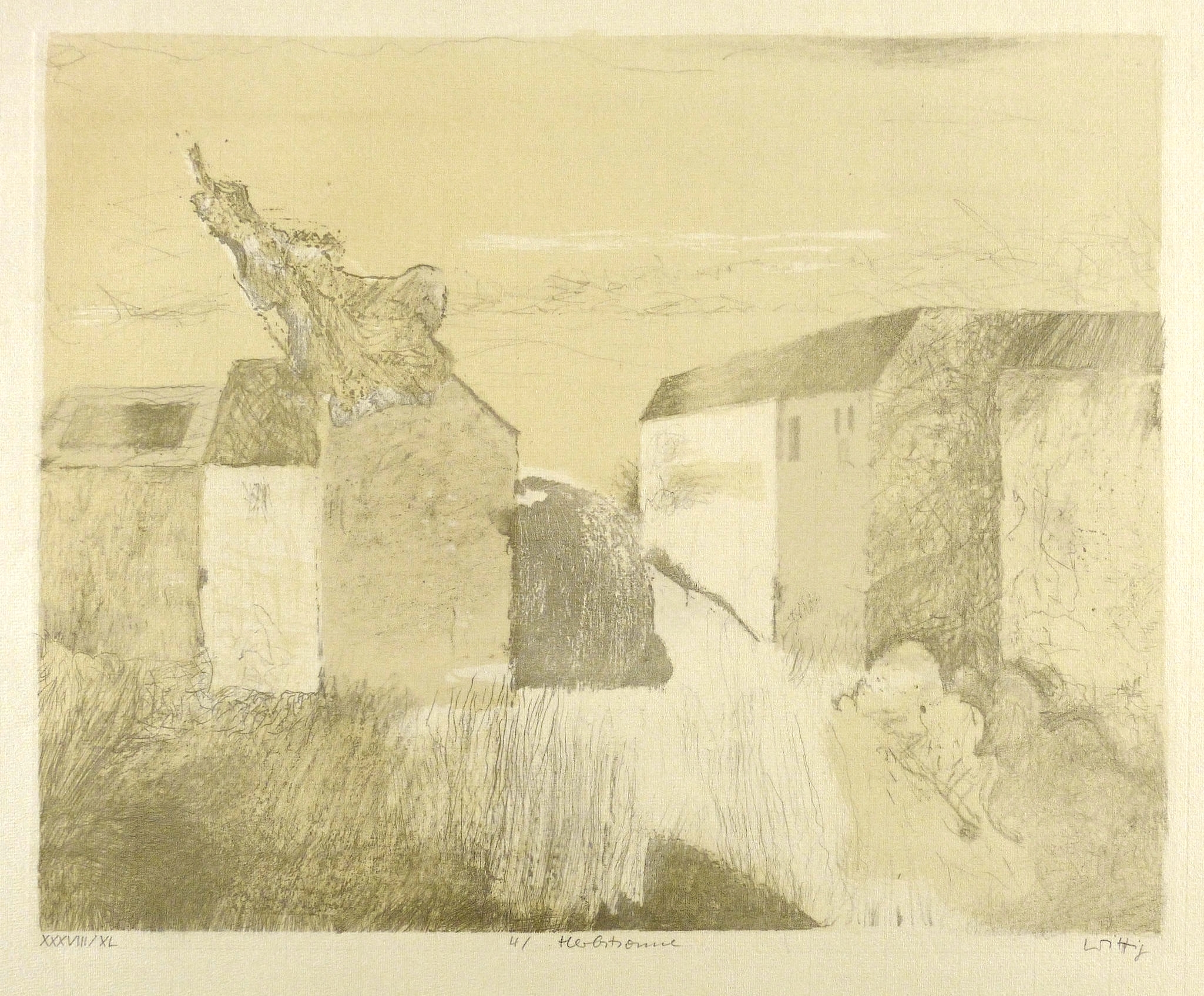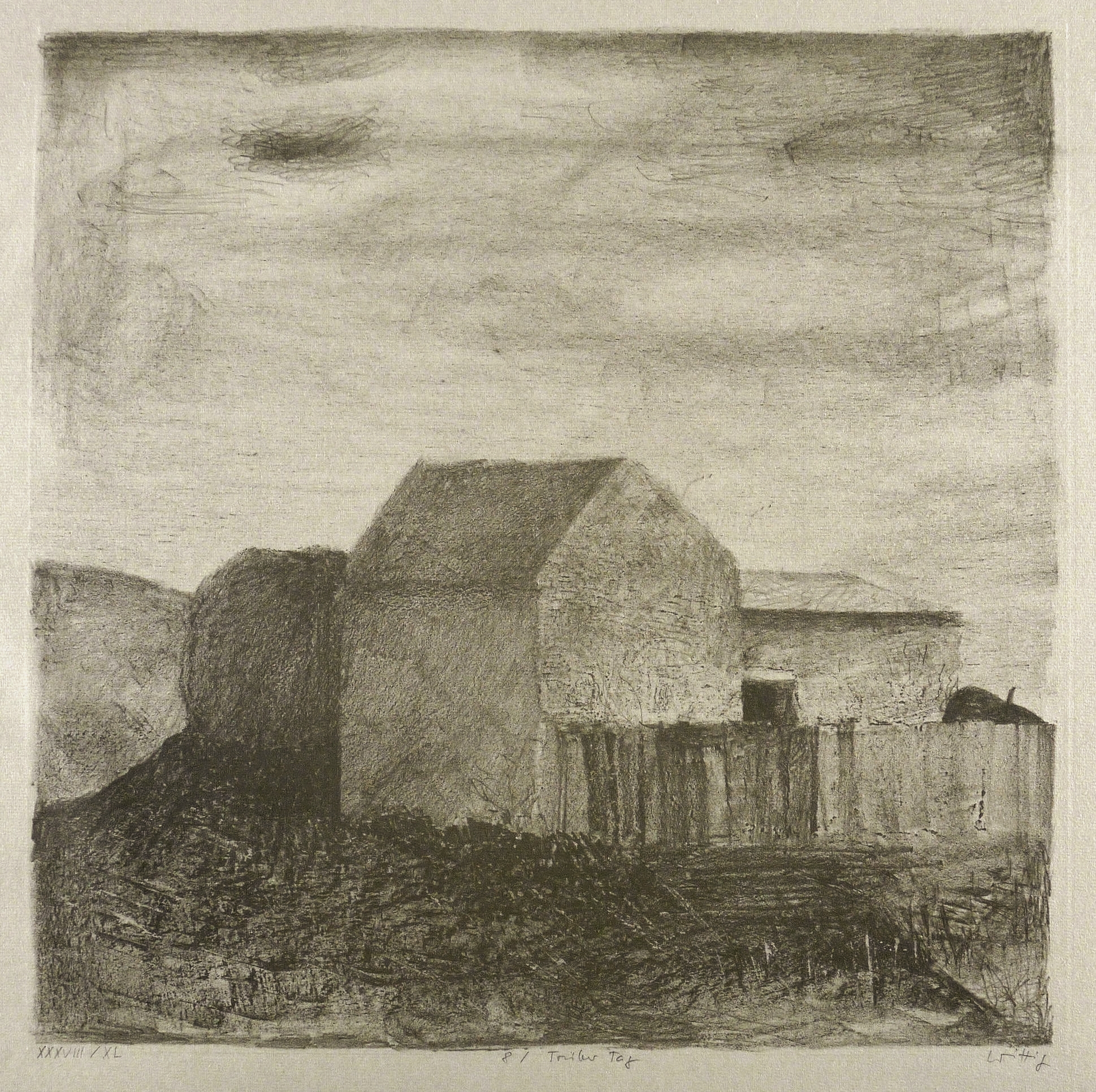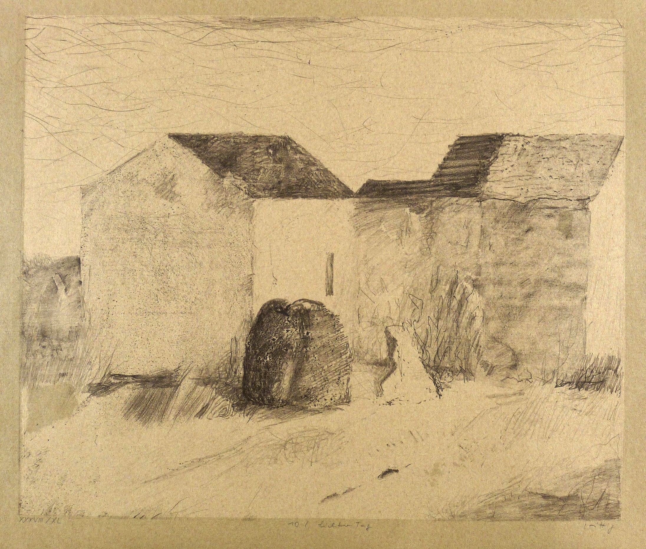 Aus: Werner Wittig, Apfer-Suite. Thema und Variationen (Radebeul: Eigenverlag 1982). – Alle Grafiken rechts unten in Bleistift signiert. Links Auflagenbezeichnung. Mittig Blatt-Nummer und Titel. – Vollständiges Mappenwerk mit den Originalgrafiken: 1. Morgendämmerung. - 2. Späte Sonne. - 3. Sommermorgen. - 4. Herbstsonne. - 5. Mittag. - 6. Am Nachmittag. - 7. Abend. - 8. Trüber Tag. - 9. Helle Nacht. - 10. Lichter Tag. – Mappe außen mit leichten Lagerspuren. Die Originalgrafiken sämtlich tadellos. Sehr guter Zustand.
