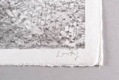 1980-1985. Zinkografie / Kreidezinkografie, in Schwarz, auf hellgelbem grobfasrigem Japan. – Originale Künstlergrafik, von Werner Wittig. – Druckerexemplar. – 53 x 64 cm (Blatt), 48,5 x 60,5 cm (Darstellung / Druckbild).
