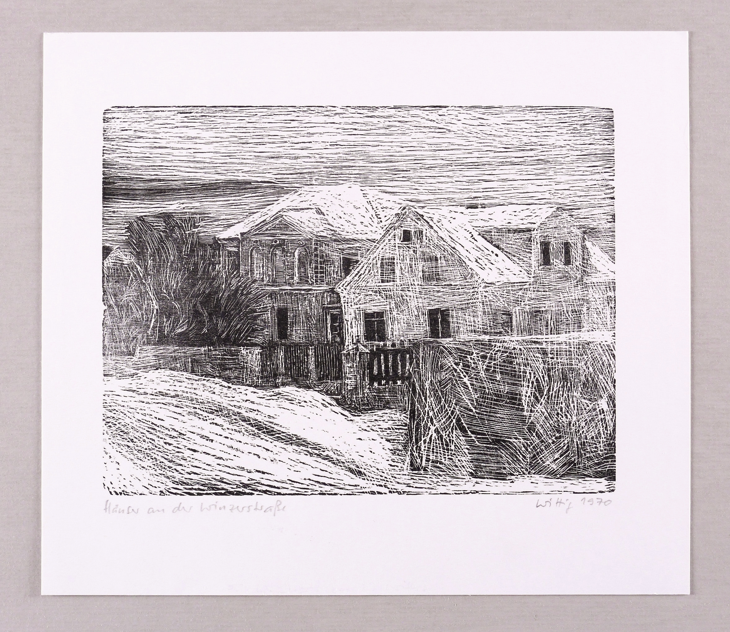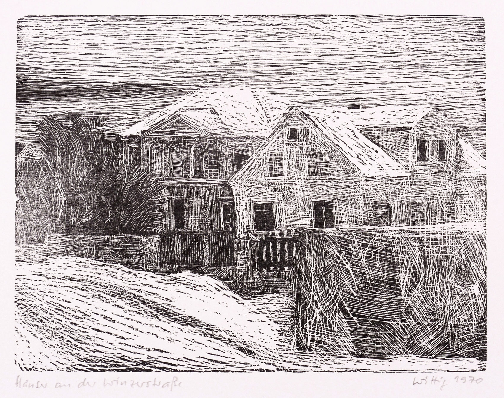 Reinhardt (2000) 16. Reinhardt (1993) 98. – Rechts unten in Bleistift signiert und datiert: ″Wittig 1970″. Links Titel: ″Häuser an der Winzerstraße″. – Sehr guter Zustand.