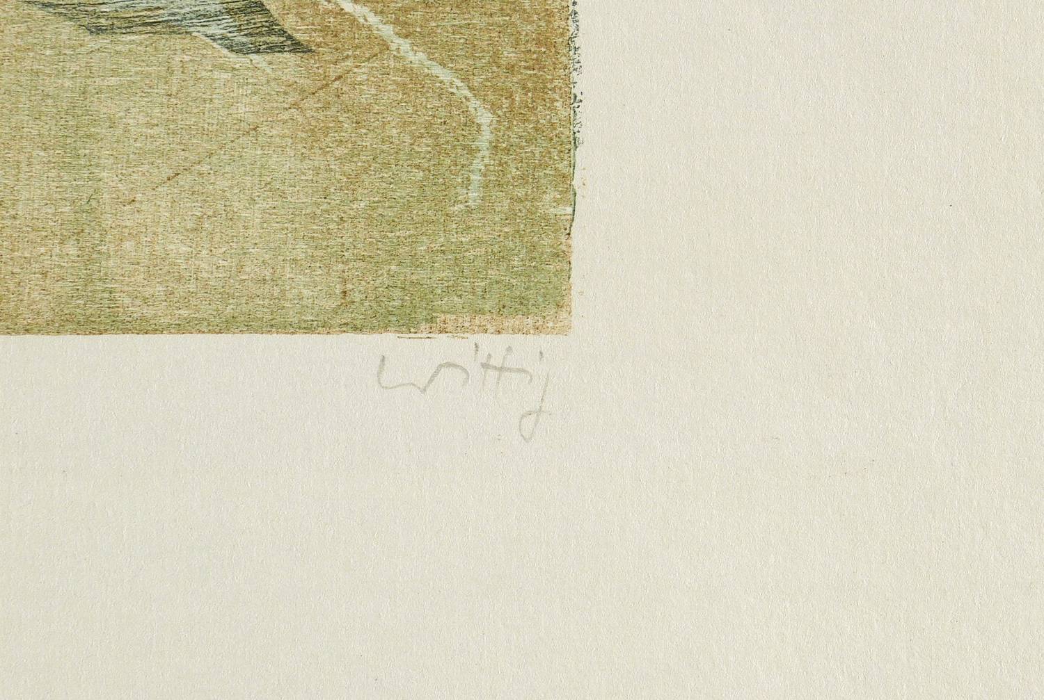 1981. Farbholzriss, in 3 Farben, auf rauem hellchamois Achat-Maschinenbütten. – Originale Künstlergrafik, von Werner Wittig. – Auflage Exemplar Nr. 58/150. – 24,5 x 29,4 cm (Darstellung / Druckstock), 38 x 50 cm (Blatt).