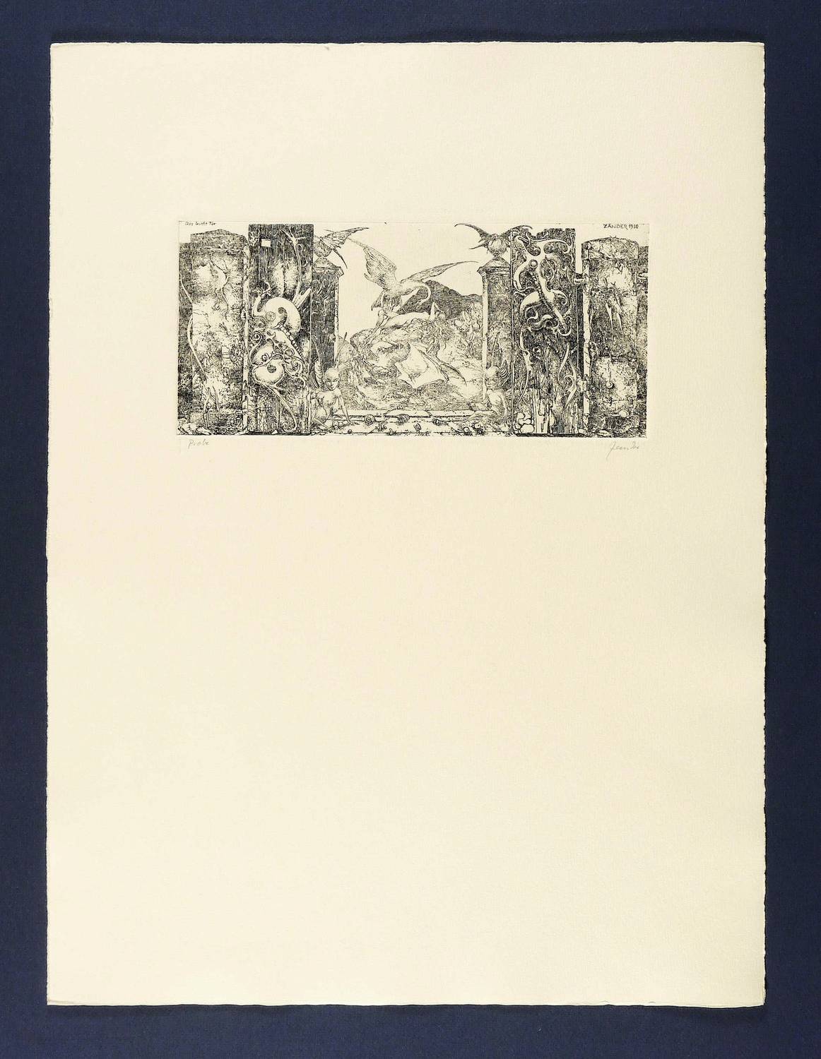 1980. Radierung / Strichätzung, in Schwarz, auf gelbem Hahnemühle-Bütten. – Originale Künstlergrafik, von Heinz Zander. – Probedruck. – 11,7 x 25,7 cm (Darstellung / Platte), 53 x 39 cm (Blatt).