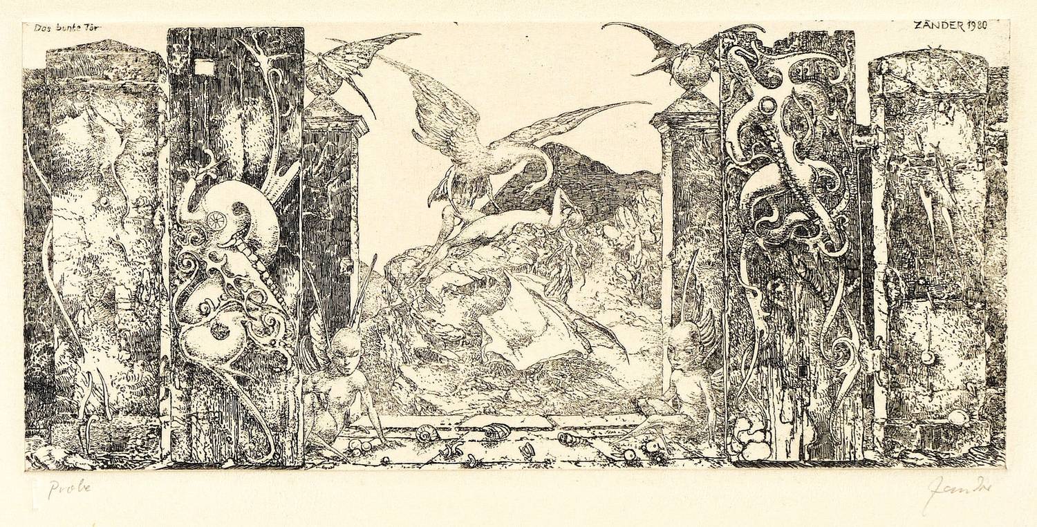 Heinz Zander (1939 Wolfen - 2024 Leipzig). Deutscher Maler, Grafiker und Schriftsteller. 1959-64 Studium an der Hochschule für Grafik und Buchkunst in Leipzig u.a. bei Bernhard Heisig. 1967-70 Meisterschüler von Fritz Cremer an der Akademie der Künste in Berlin (Ost). Seit 1970 freischaffend. Namhafter Vertreter der realistisch-manieristischen Strömung der Leipziger Schule. Seine an altmeisterlicher Manier orientierte Malweise lässt Vorbilder wie Hieronymus Bosch, Albrecht Altdorfer, Matthias Grünewald sowie die italienischen Manieristen erkennen.