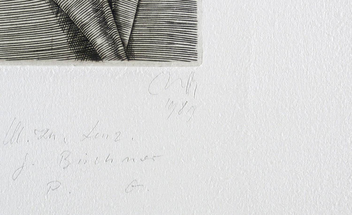 1972/1989. Kupferstich / Linienstich, in Schwarz, auf weißem Velin. – Originale Künstlergrafik, von Baldwin Zettl. – Auflage Exemplar Nr. 22/76. – 26 x 18 cm (Blatt), 11,6 x 8,2 cm (Darstellung / Platte).
