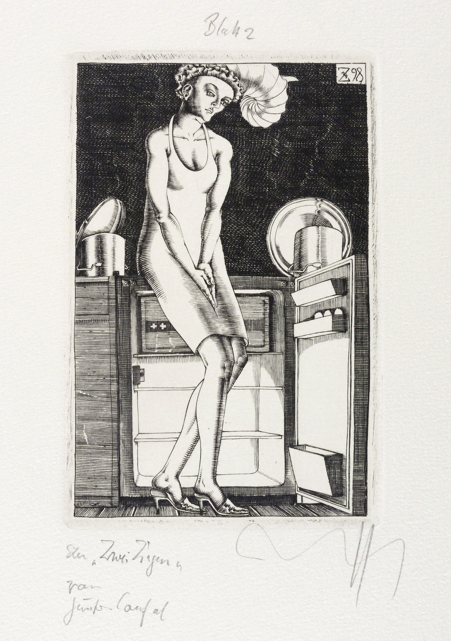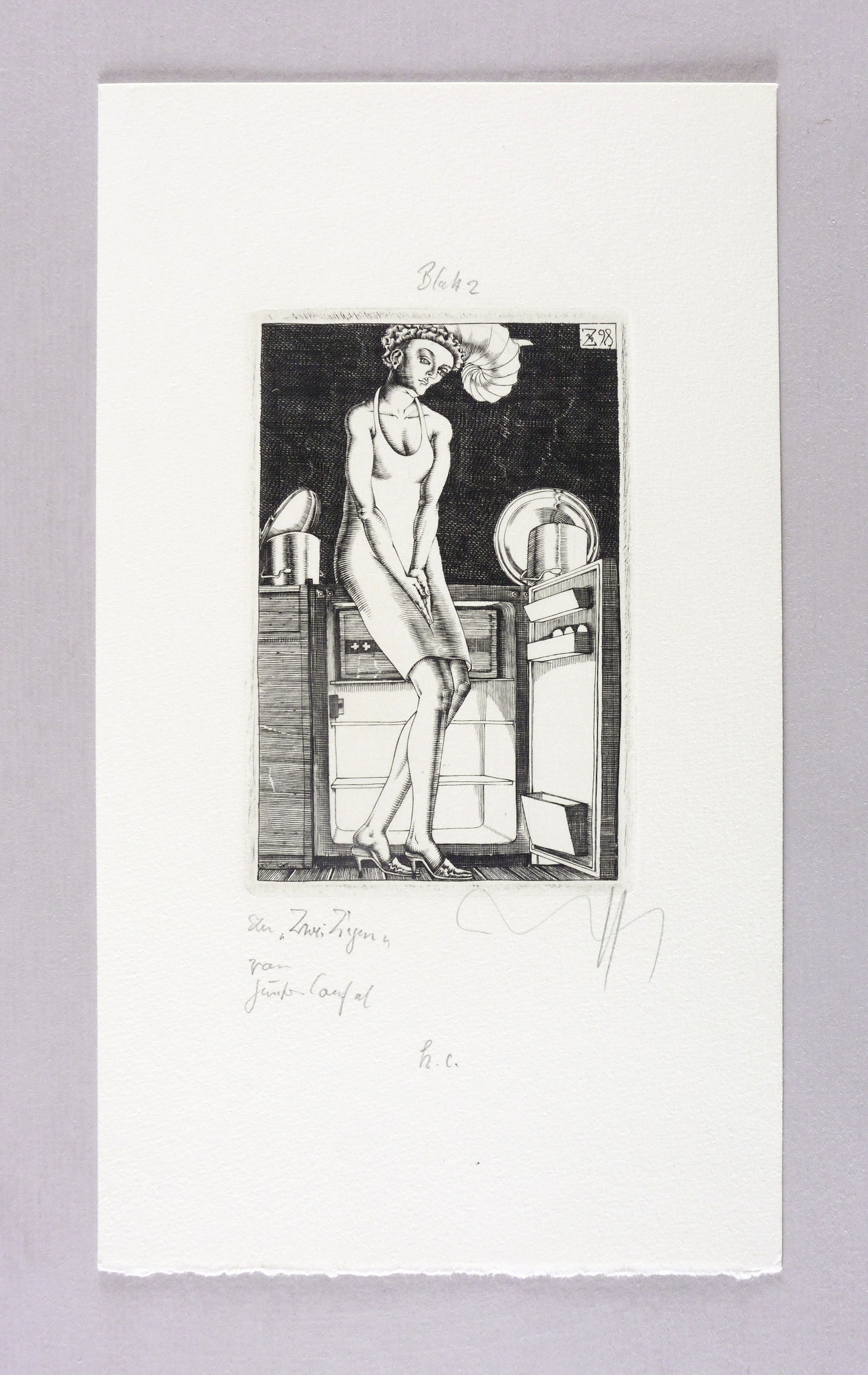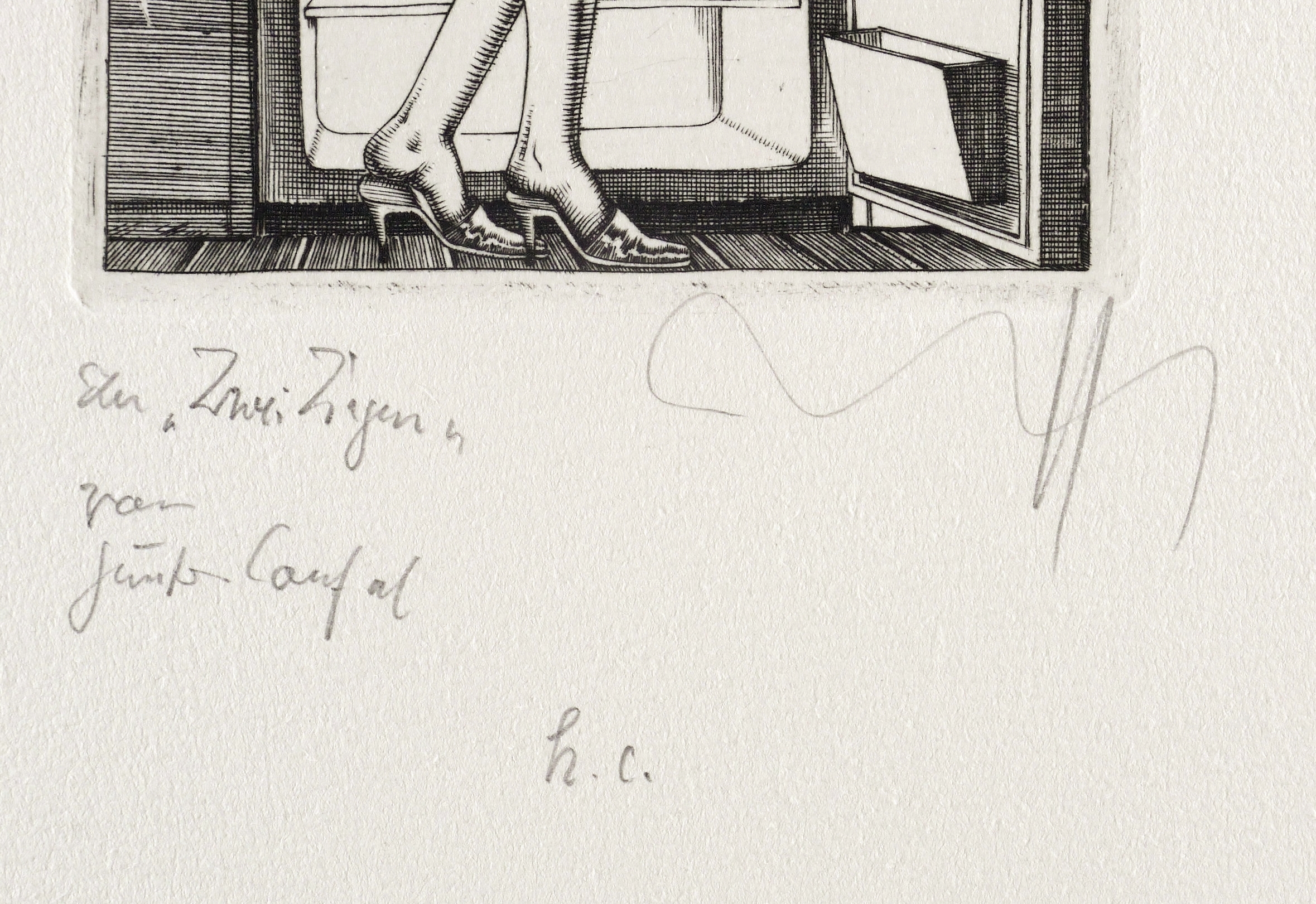 Lübbert 98/2. – Rechts unten in Bleistift signiert: ″Zettl″. Links Titel: ″zu Zwei Ziegen von Günter Confal″. Weiter Auflagenbezeichnung: ″h.c.″ – Sehr guter Zustand.