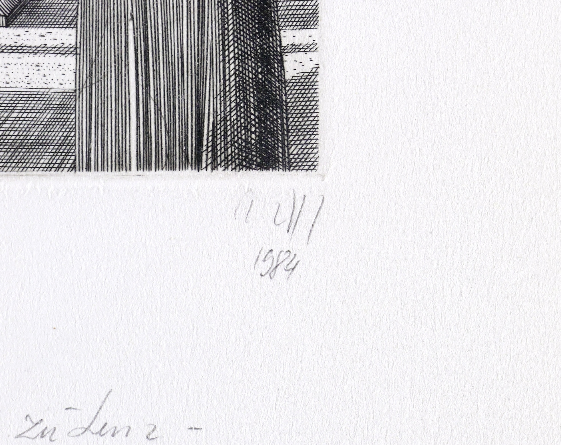 1972/1982. Kupferstich / Linienstich, in Schwarz, auf weißem Velin. – Originale Künstlergrafik, von Baldwin Zettl. – Auflage Exemplar Nr. 71/76. – 26 x 17 cm (Blatt), 11,7 x 8,2 cm (Darstellung / Platte).