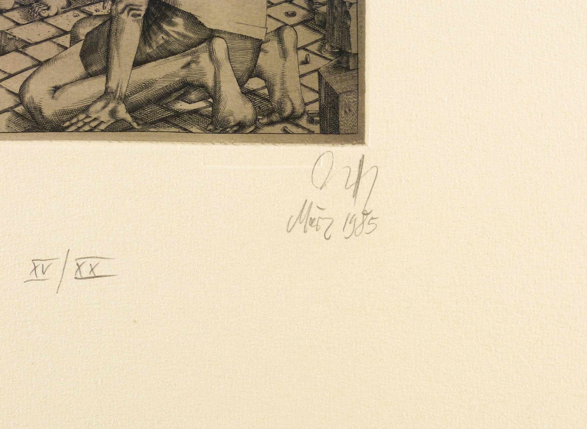 1984/1985. Kupferstich / Linienstich, in Schwarz, über grauem Fond, auf chamois Hahnemühle. – Originale Künstlergrafik, von Baldwin Zettl. – Auflage Exemplar Nr. XV/XX. – 18,7 x 17,6 cm (Darstellung / Platte), 54 x 40 cm (Blatt).