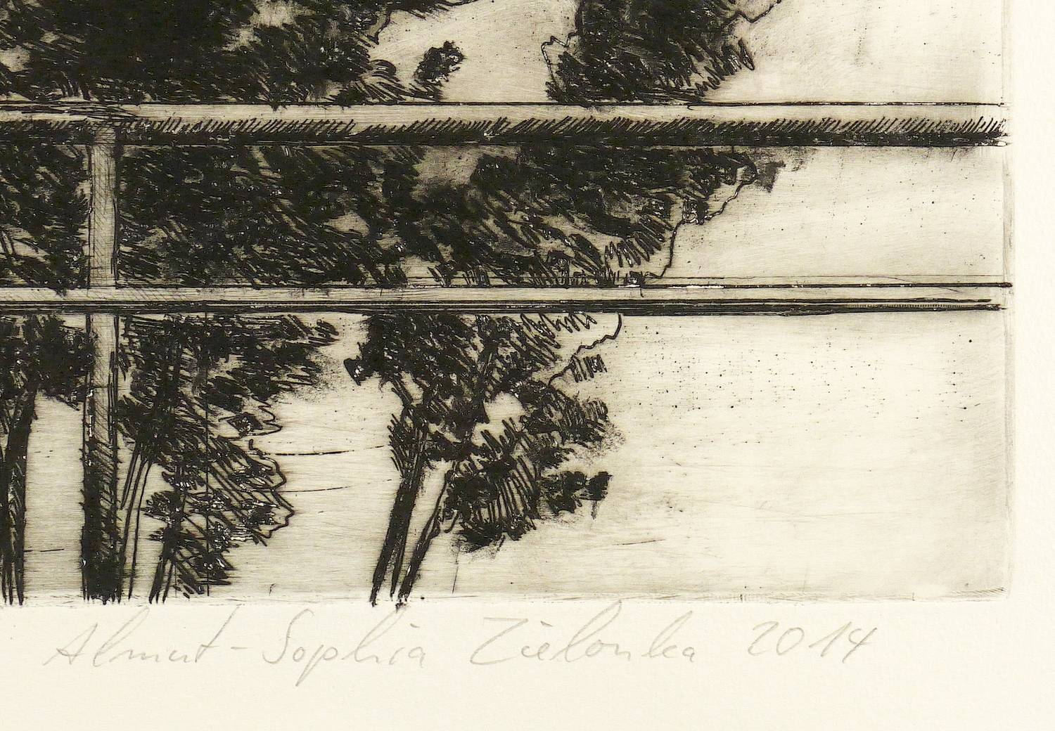 2014. Radierung / Kaltnadelradierung, mit Bleistift überarbeitet, auf Hahnemühle-Bütten. – Originale Künstlergrafik, von Almut-Sophia Zielonka. – Auflage Exemplar Nr. 18/20. – 49,5 x 64,0 cm (Darstellung / Platte), 63,0 x 78,5 cm (Blatt).