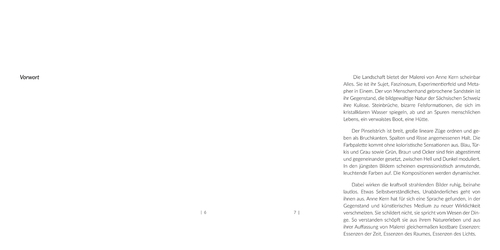 Anne Kern (*1981 Dresden, lebt und arbeitet in Wehlen/Sächsische Schweiz). Deutsche Malerin und Grafikerin. 1999-2006 Zeichenschule bei Klaus Drechsler. 2000-04 Studium der Sozialpädagogik/Sozialarbeit an der evangelischen Hochschule in Dresden. 2000-02 Besuch der Neuen Abendschule der Hochschule der Bildenden Künste in Dresden. 2004-09 Studium der Malerei/Grafik an der Hochschule für Grafik und Buchkunst in Leipzig bei Prof. Annette Schröter. Seit 2009 freischaffend tätig. 2011 Geburt des Sohnes Theodor Sander. 2012 Gründung der Kunstmeile Wehlen (KMW) - Interessengemeinschaft der ortsansässigen Künstler und Kunststätten mit jährlichen Programm. 2014 Ausbau und Einzug in das Atelierhaus "Schöne Aussicht" in Wehlen.
