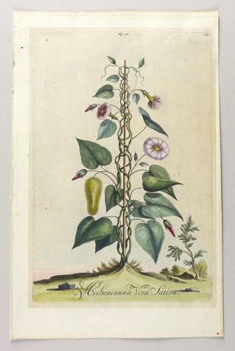 Aus: Abraham Munting, Naauwkeurige Beschryving der Aardgewassen. waar in de veelerley aart en bijzondere eigenschappen der boomen, heesters, kruyden, bloemen met haare vrugten, zaden, wortelen en bollen, neevens derzelver waare voortteeling gelukkige aanwinning, en heylzaame geneeskrachten, na een veel-jarige oeff (Leyden & Utrecht: Pieter van der Aa & Francois Halma 1696). – In der Darstellung unten betitelt. Im oberen Plattenrand nummeriert. – Bei Samuel Hahnemann als Mechoakanwinde (Convolvulus leticucu, Pis. Convolvulus Mechoacanna) beschrieben. – Dem Alter entsprechend guter Zustand. Leichter Lichtrand um die Platte. Verso Rahmungsspuren. Insgesamt guter Zustand.